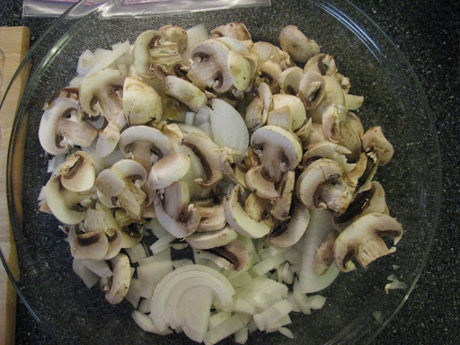 I decided to look around, and I found white button mushrooms, and some yellow onions, provolone cheese…and so…I chopped the onions, sliced the mushrooms…
