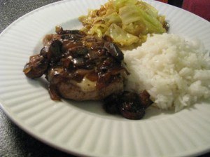 In the meantime, add the onions and mushrooms to the oil. I add the Herbs De Provence (about 1 full tablespoons) to this mix. Sauteed until golden. Add in vinegar and reduce. Right before serving, add butter and stir. Serve with the pork chop down and spoon some broth over…then the mushrooms and onions.