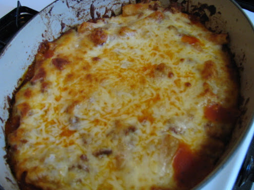 So, cook pasta, drain. Add to meat sauce. Mix in 2 cups of mozzerella. Top with some of the sauce, and more cheese.