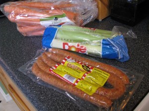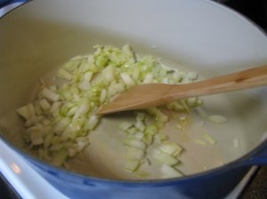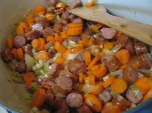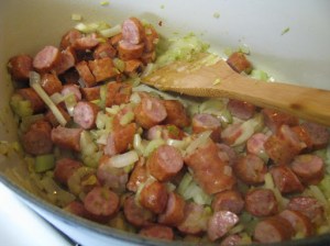 Begin by sauteing an onion in some olive oil.  Add celery, and sausage.