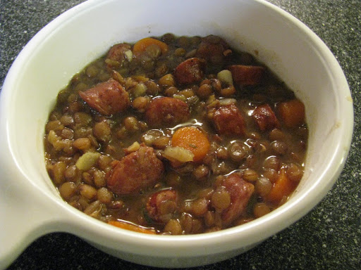 My Mom used to make lentils, a thick concoction, with a ham hock.  She also served it over noodles or spatzle.  I really loved that. I love this version as well.  Although tonight, I had hickory smoked sausage.