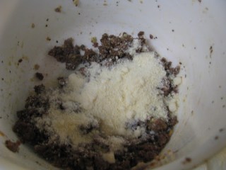 Take the hamburger, onion, add the pulp, and Parmesan cheese.