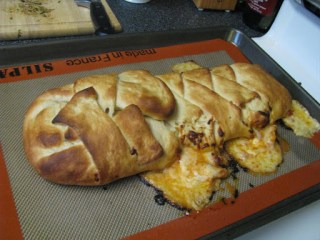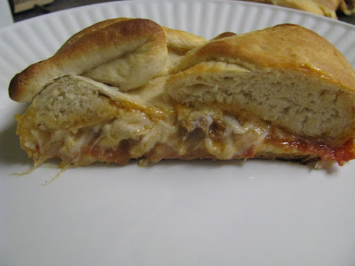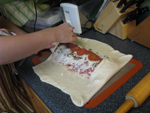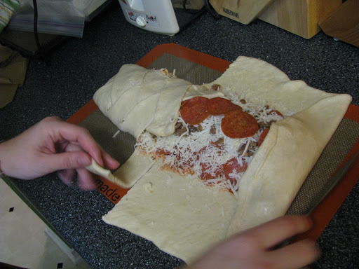 pepperoni, six-Italian cheese, sausage (browned), more cheese, pepperoni. Keep everything down the center (it helps with the folding).