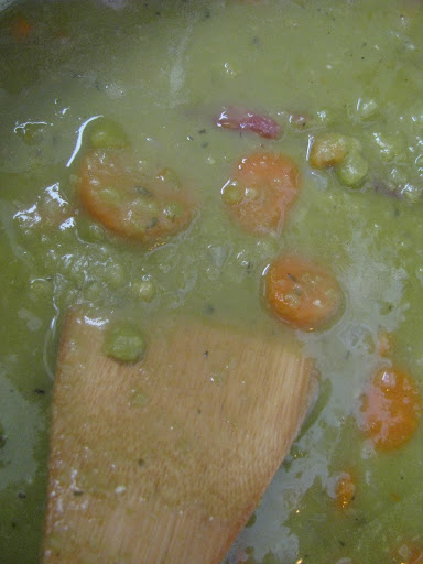 Yummy, no blender needed. Chunky carrots, and bits of pork, lots of creamy peas.