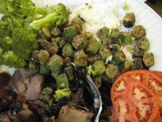 Okra with rice, sliced tomatoes, London Broil, and broccoli.
