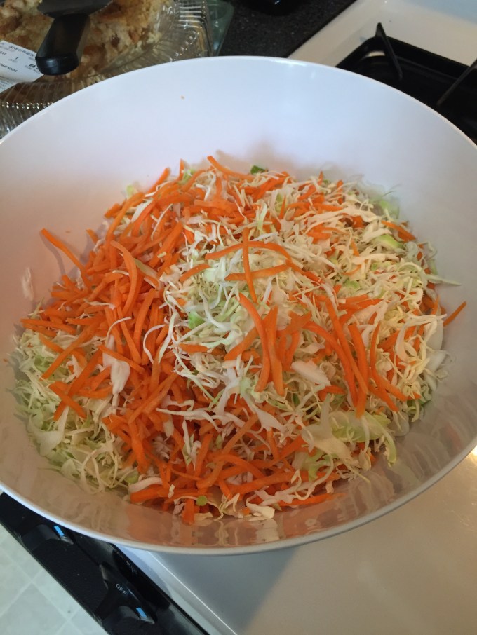 I mix the cabbage, carrots, parsley, and scallions in a large bowl.