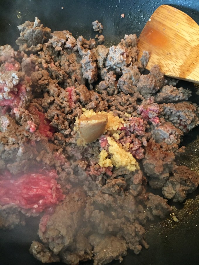 Brown the hamburger meat, drain fat (if any), add garlic, ginger and some salt and pepper.