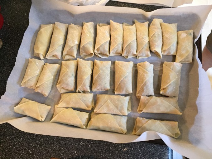 Roll the egg rolls per the package directions, and place on a parchment lined cookie sheet.