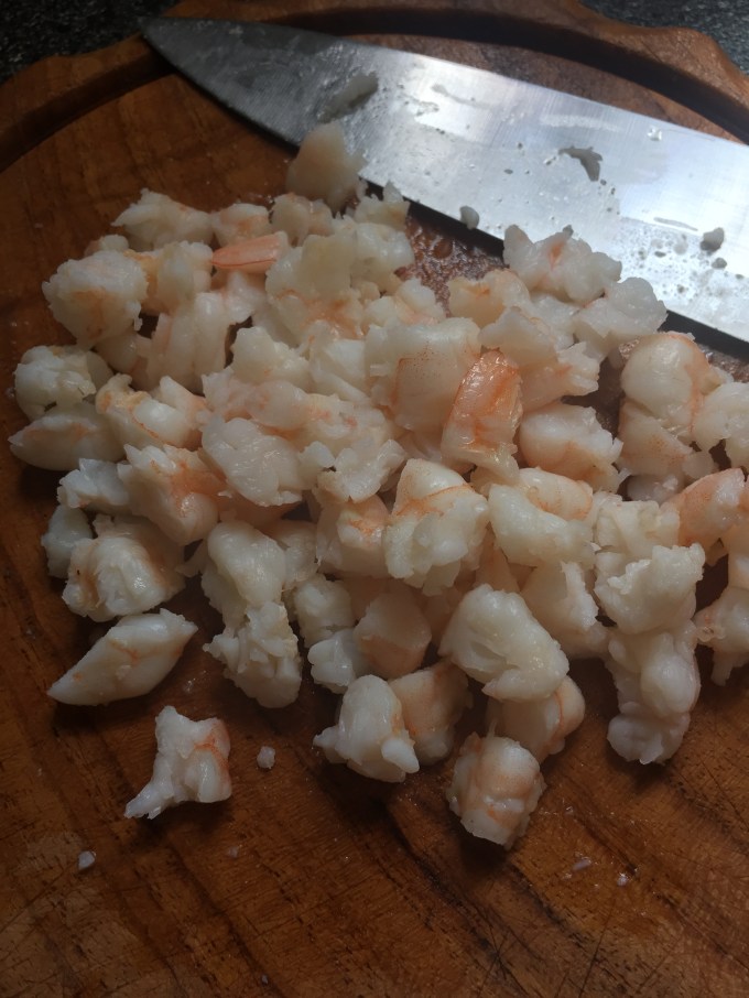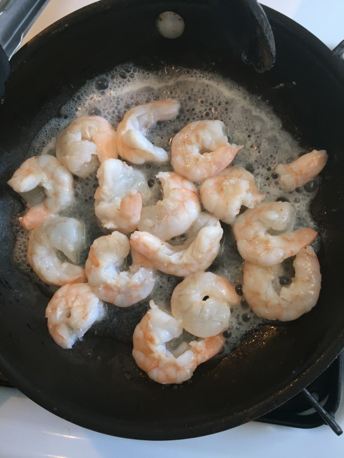 I love most seafood. And shrimp are super easy to prepare, and cook up quickly so they make a great salad. They are also full of protein. 11 Grams for 3 ounces. I took about ten medium shrimp and sauteed them in a pat of butter and salt. Just to add a bit of richness.