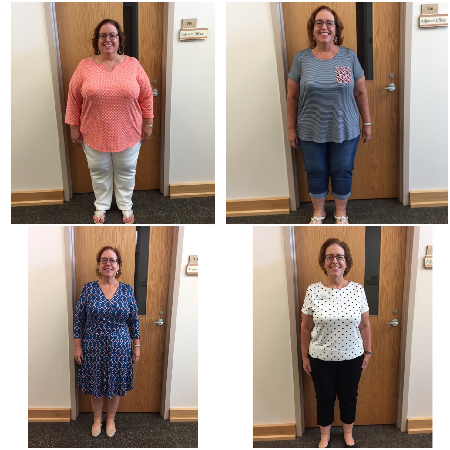 What is so weird about these pictures is how I felt at each station. Peach shirt, right before surgery: great, I have stuck to the liquid diet and I can do this. Blue stripe shirt: more pounds gone. Feeling confident in my skin. Wrap dress: I could never wear this before. Really! And today, I feel small. I know that I still have a ways to go but this I see. 50 inches gone. Size 14 PXL. A year ago I was wearing a 26/28 and felt okay about it. Never again.