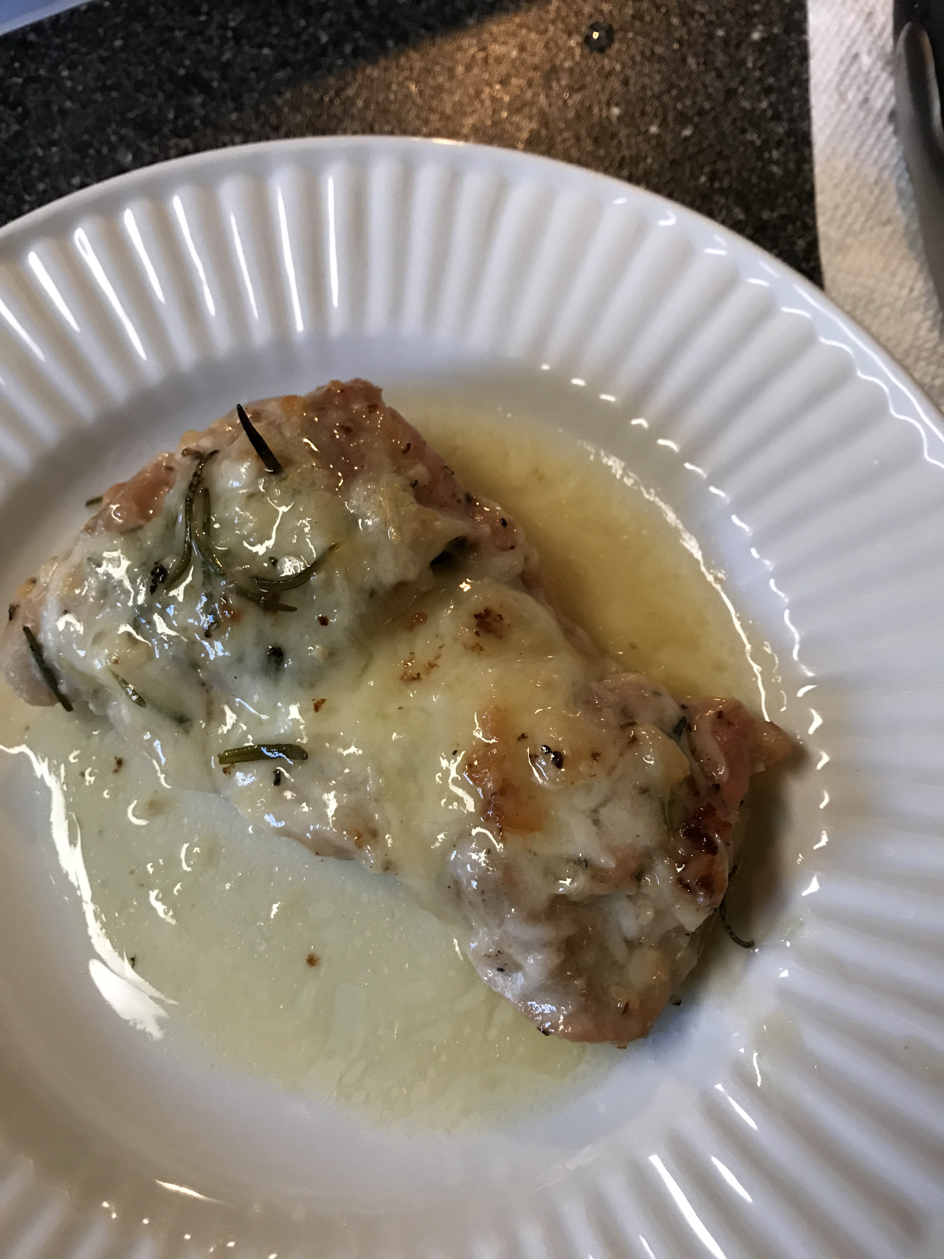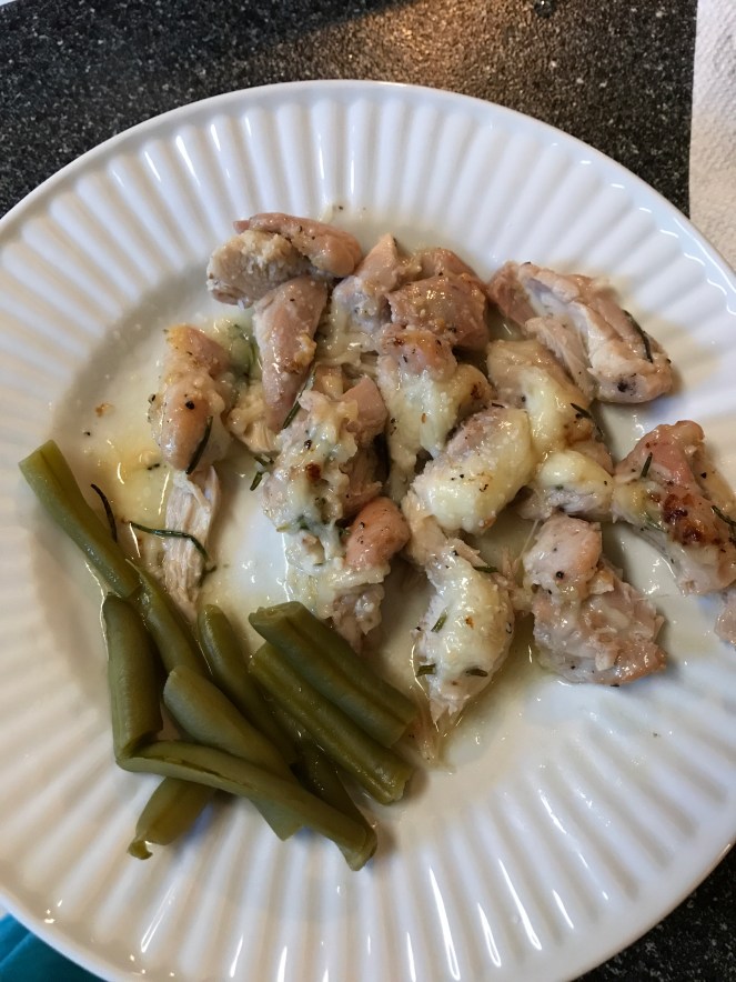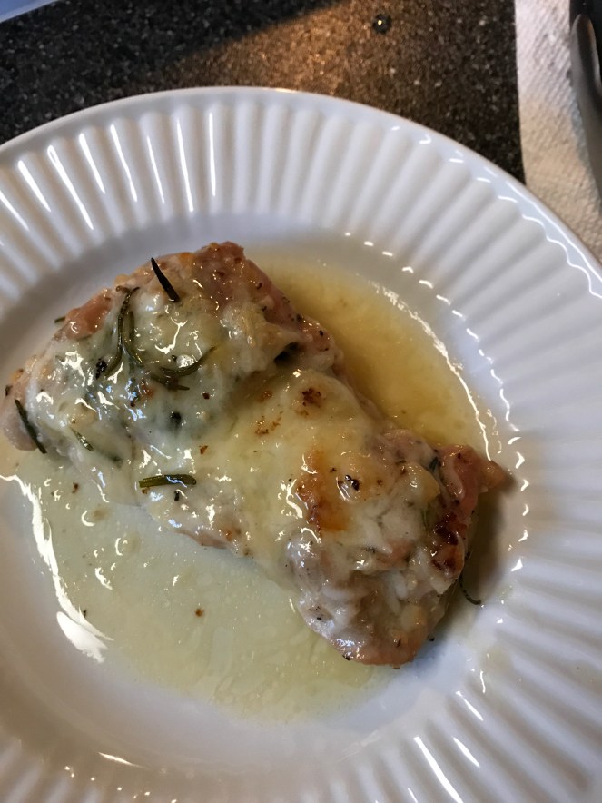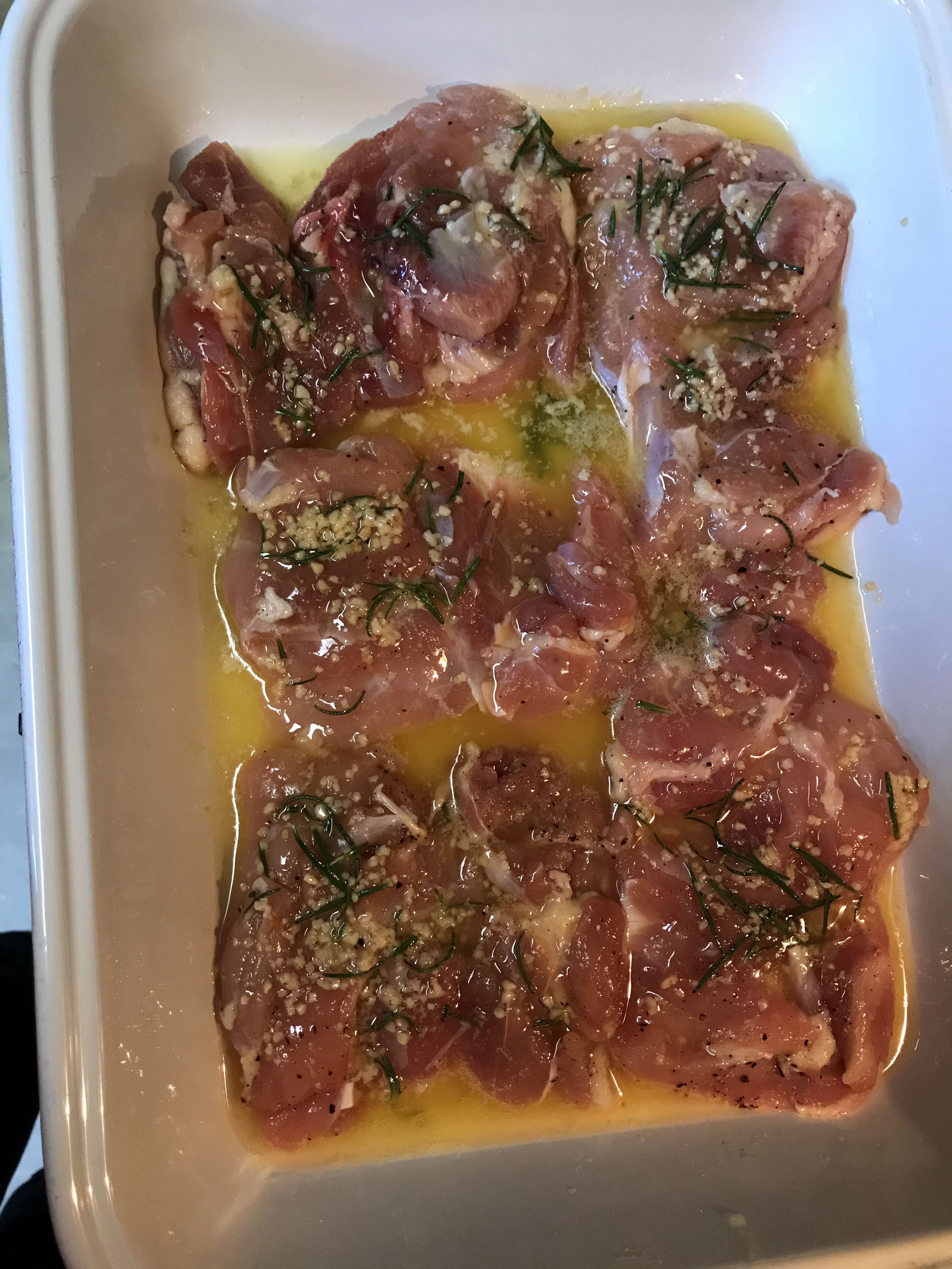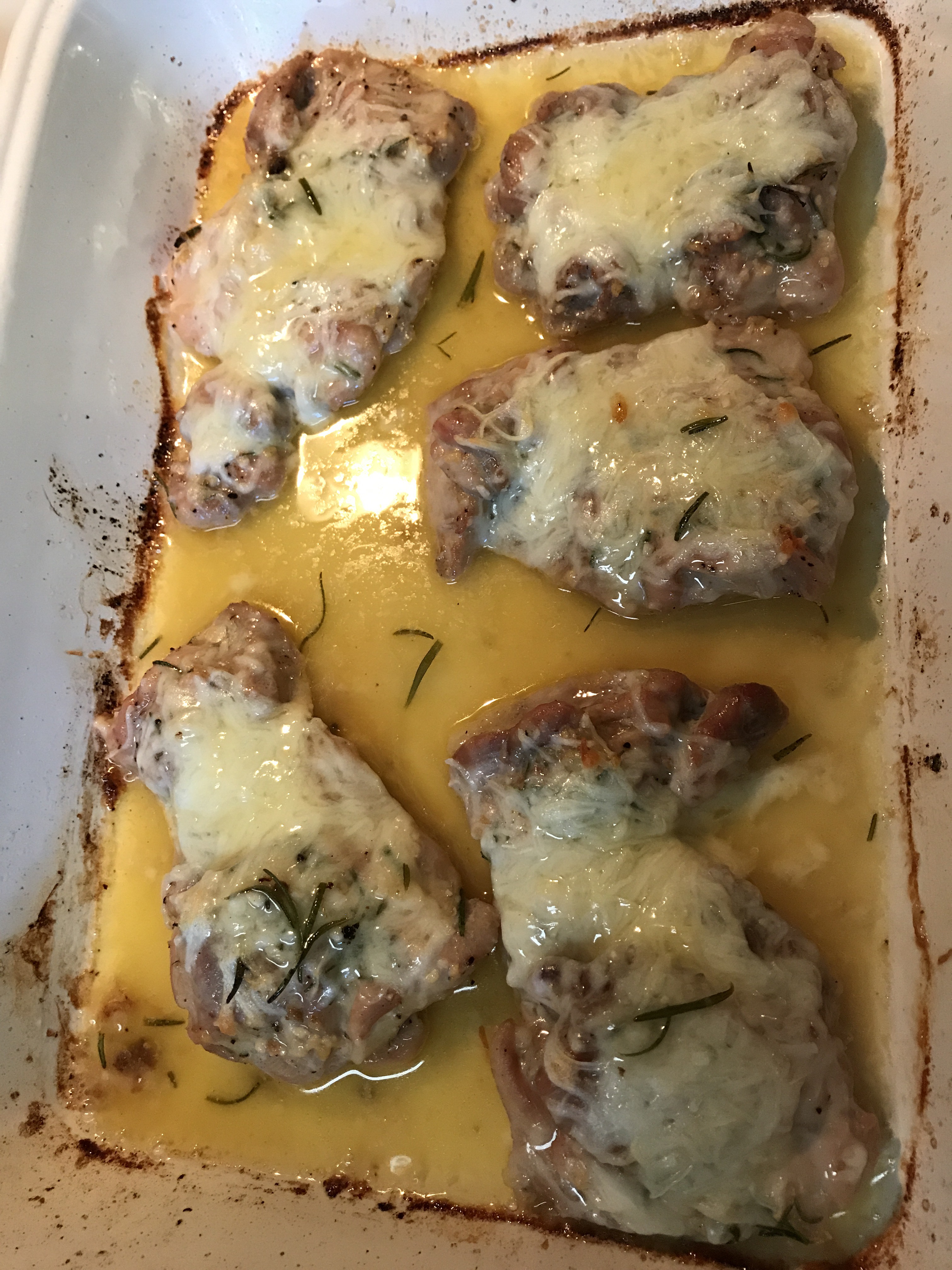 A stick of unsalted butter, a tablespoon of garlic (minced), and 1/4 cup of fresh rosemary sauteed until lightly cooked. 5 boneless, skinless, chicken thighs.