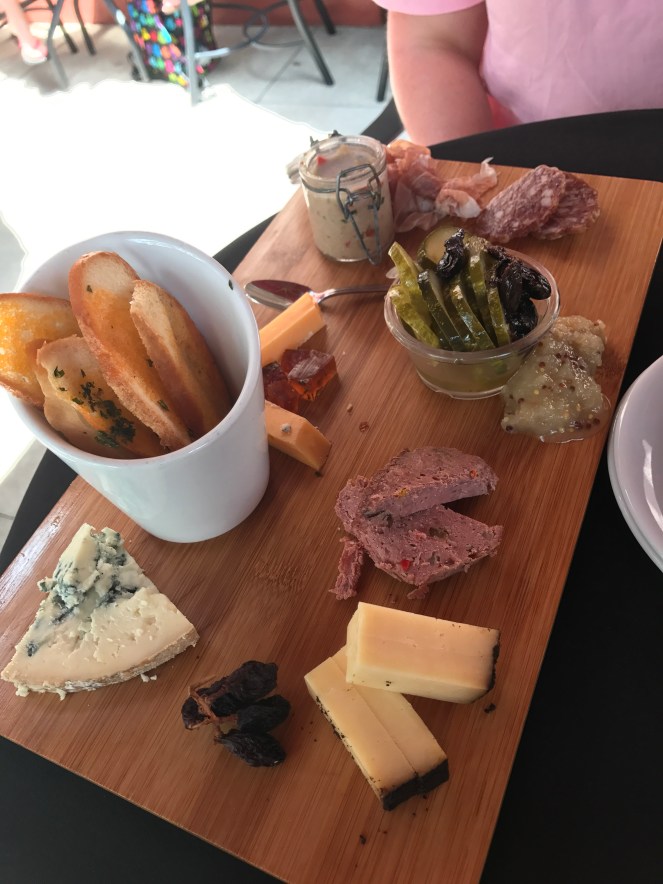 This board was super flavorful with blue, cheddar, Gouda cheese, prosciutto, hard salami, duck pate’ and I don’t remember the other pate, fresh pickles and kalamatas, dried fruit, and a ground mustard with applesauce. The crackers were enjoyed more by Carmen, but I did have one.