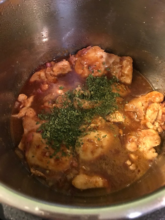 Stir, and scrap the bits from the bottom of the pot. Add the chicken and the sauce mixture then add the parsley.