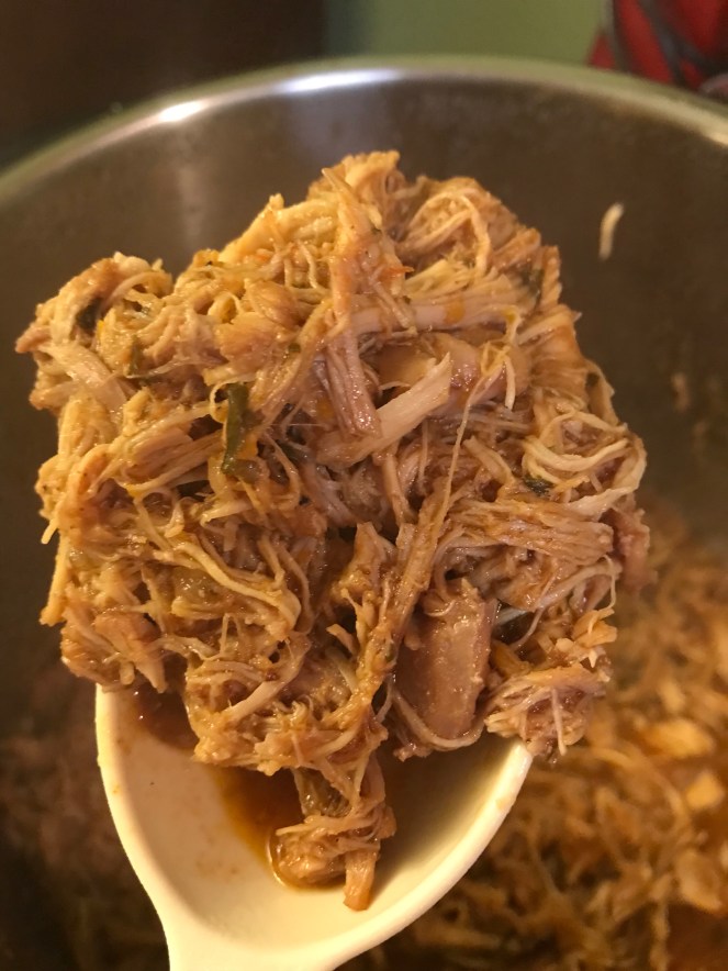 Pressure cook for 15 minutes. Manually release, and remove chicken. Shred with two forks.