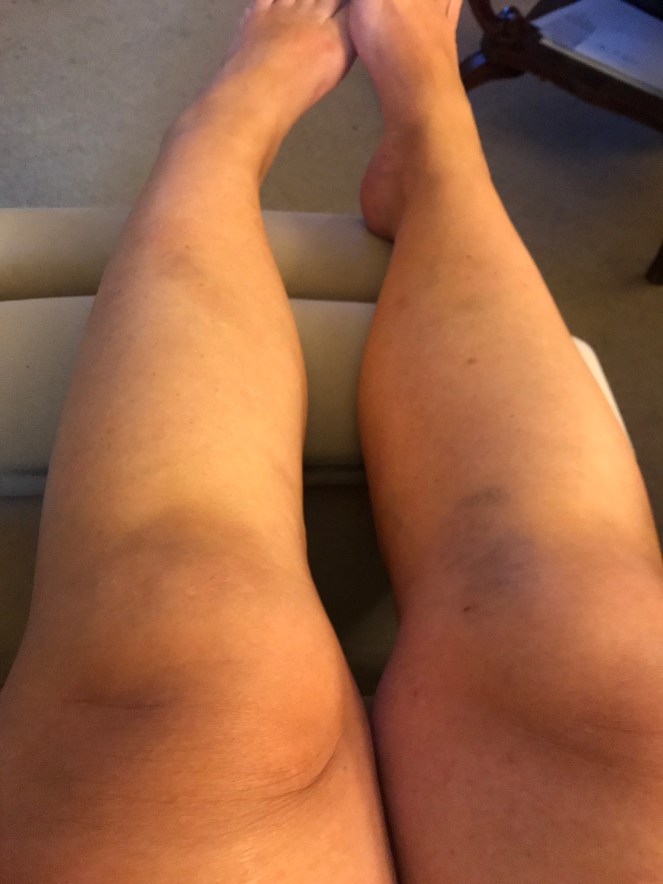 I fell the other day…so the bruises on my knees are from the fall. The other bruises…I have no clue where they came from from…really? Top of my right foot to my left shin…I have some on my arms, hands…have no clue…they might be from the fall but they are in odd spots as well.