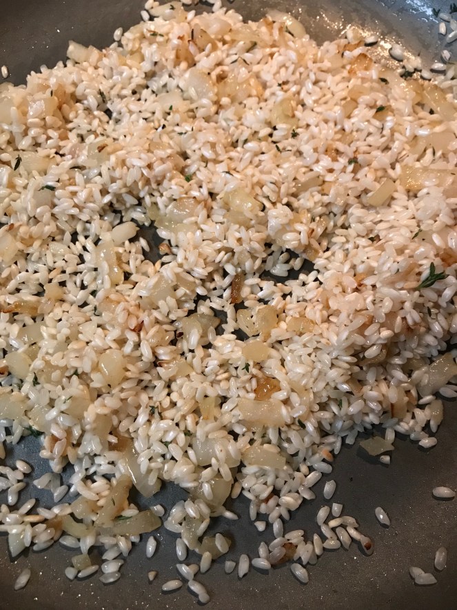 Everyone seems to think that risotto is hard, and it can be, as you have to constantly stir and tend to it. But if you are willing to do that, this dish is wonderful. Start by adding Arborio Rice to a dry skillet to toast for about two to three minutes or until the rice is warm.
