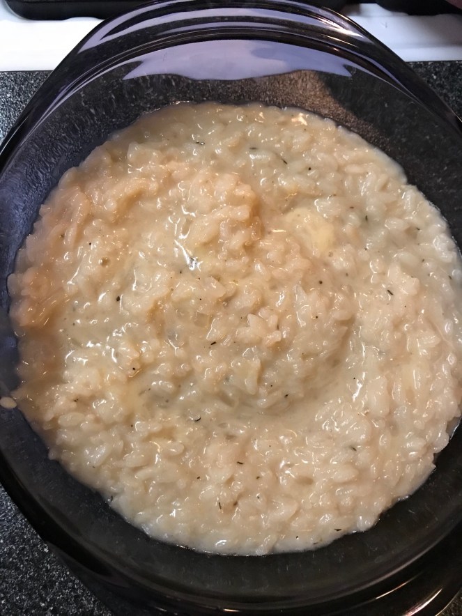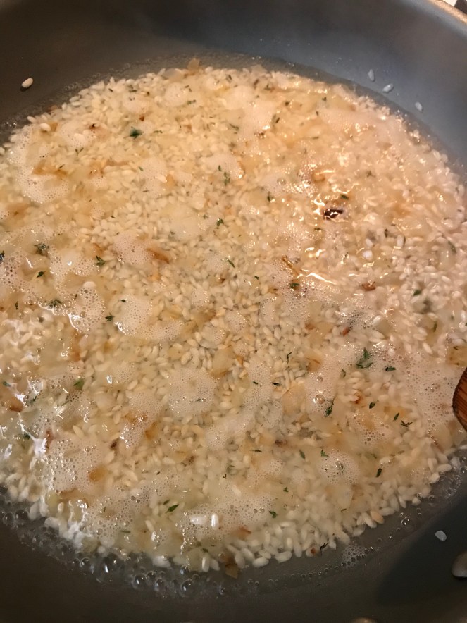 Then add one cup of good white wine (whatever wine you would actually drink). Simmer until absorbed, stirring constantly. Add about one teaspoon of fresh thyme, salt and pepper. Bring to a simmer two cups of chicken stock in a separate pot, and add to the rice mixture one ladle at a time, stirring, until the liquid is absorbed each time. This will take about 20-25 minutes over a slow simmer. Again this takes time so don’t rush the rice. Be gentle in stirring, and let the rice absorb the liquid.