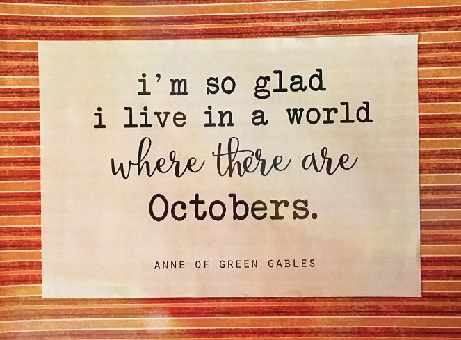 I love Anne of Green Gables, and this is one of many of my favorite quotes from the book. It was an appropriate feeling for me growing up in NW Arkansas. Falls there are a true Fall with yellow, orange and browns in the trees, the cool mornings and nights. A true Fall.