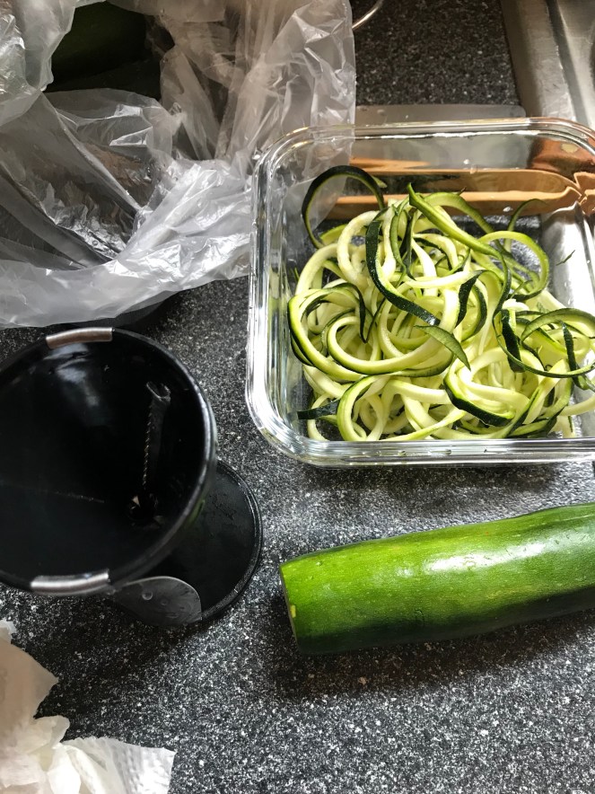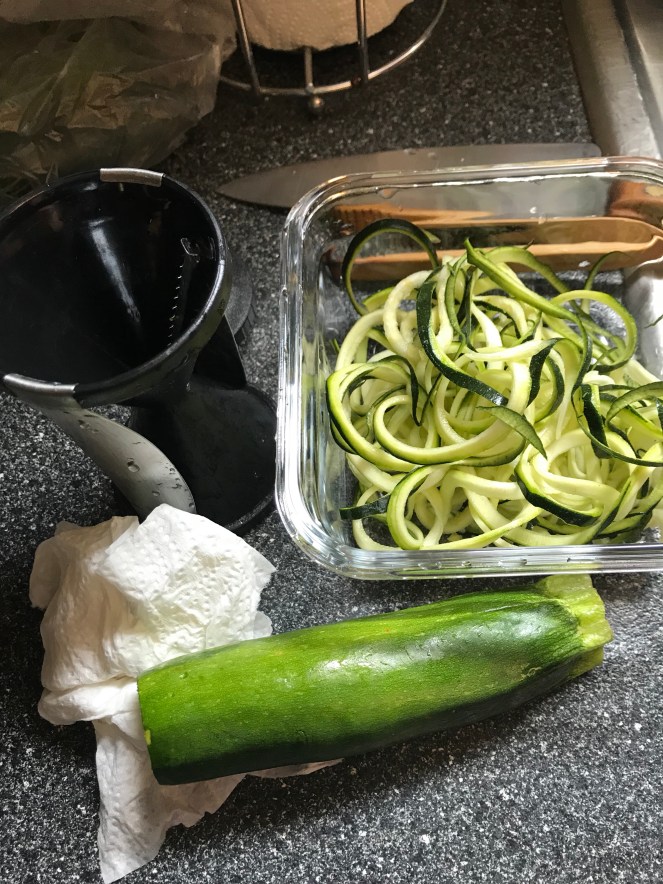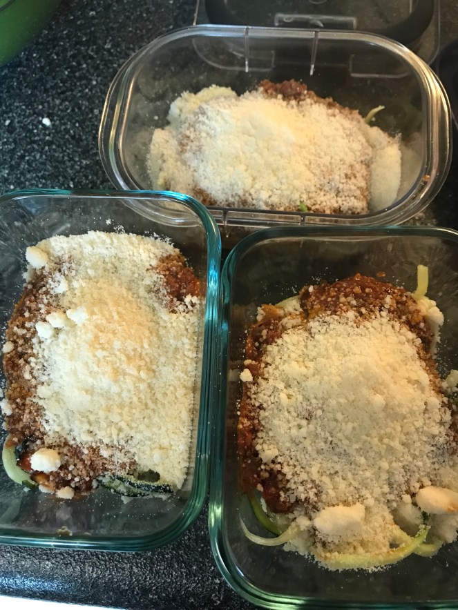 Four meals…well, one is zucchini noodles with some olive oil, salt and pepper – with shrimp that I had sauteed as I had ran out of meat sauce.