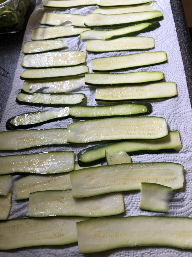 Wipe off the moisture from the zucchini, and place into a 9×9 dish sprayed with non-stick cooking spray.Â