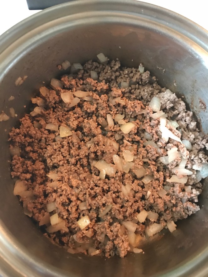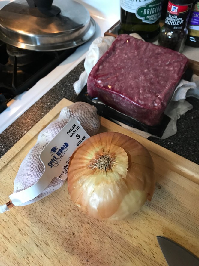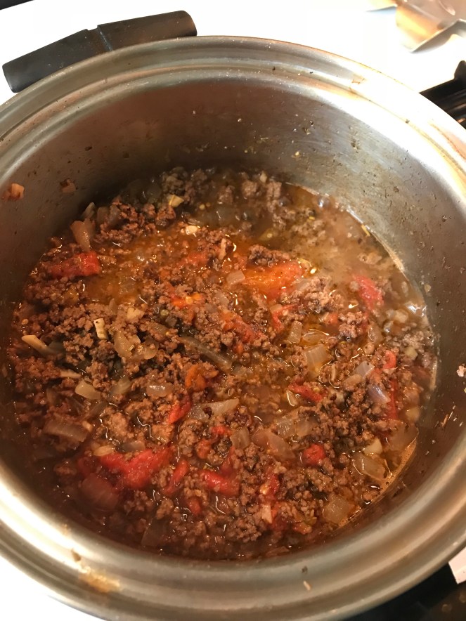 For the sauce: pound of ground beef, 3 cloves of garlic, and a medium onion. Sauteed until cooked through.