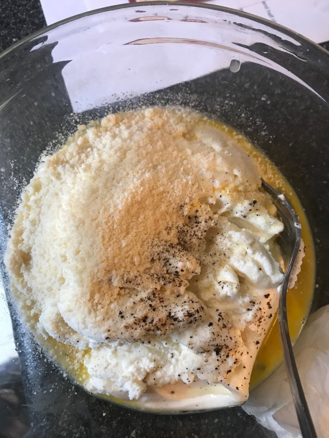 Mix together a small container FULL FAT ricotta cheese, 1/2 cup parmesan, egg, and a generous amount of pepper.