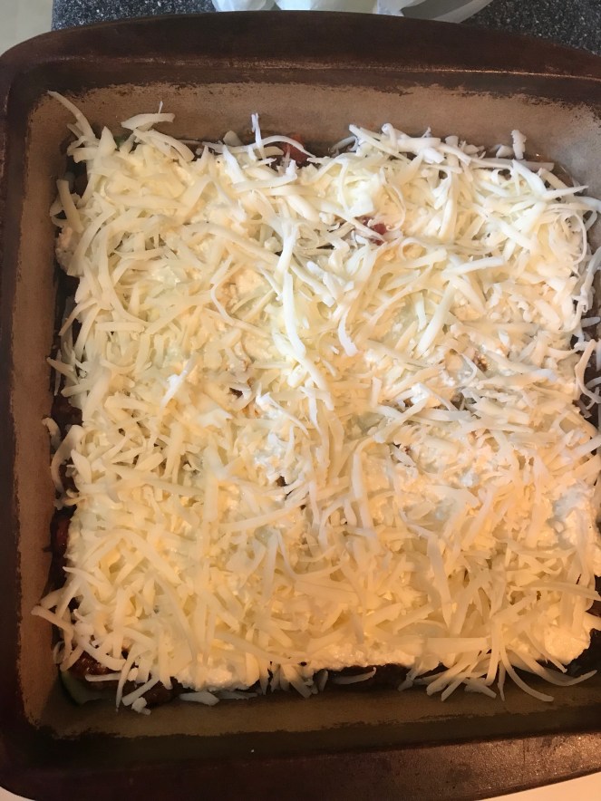 Continue with the noodles, and repeat until meat and cheese are done. Top with remaining mozzarella and Parmesan cheese. Spray aluminium foil with non-stick spray and cover the pan, bake for 45 minutes at 350 degrees.