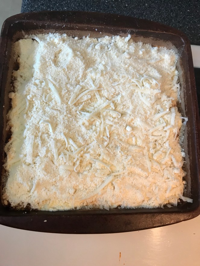 I added some shredded cheddar cheese to both meats, and yes, I cheated and used packaged shredded cheddar cheese.  For the remaining dough, I rolled it thin, and placed it in a baking sheet that I sprayed with baking spray.
