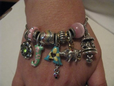 So from left to right…Peridot (August’s birthstone), pink gems spacer, J with pink flowers (of course, how did Brighton know?), rainbow spacer (David got that one for me), A with a lady bug (My Mom’s favorite – again, how did Brighton know?), silver and gold spacer, Arkansas Pig (Yep, I am a Razorback), pink tiger eye spacer, and my newest – the carousel.Â