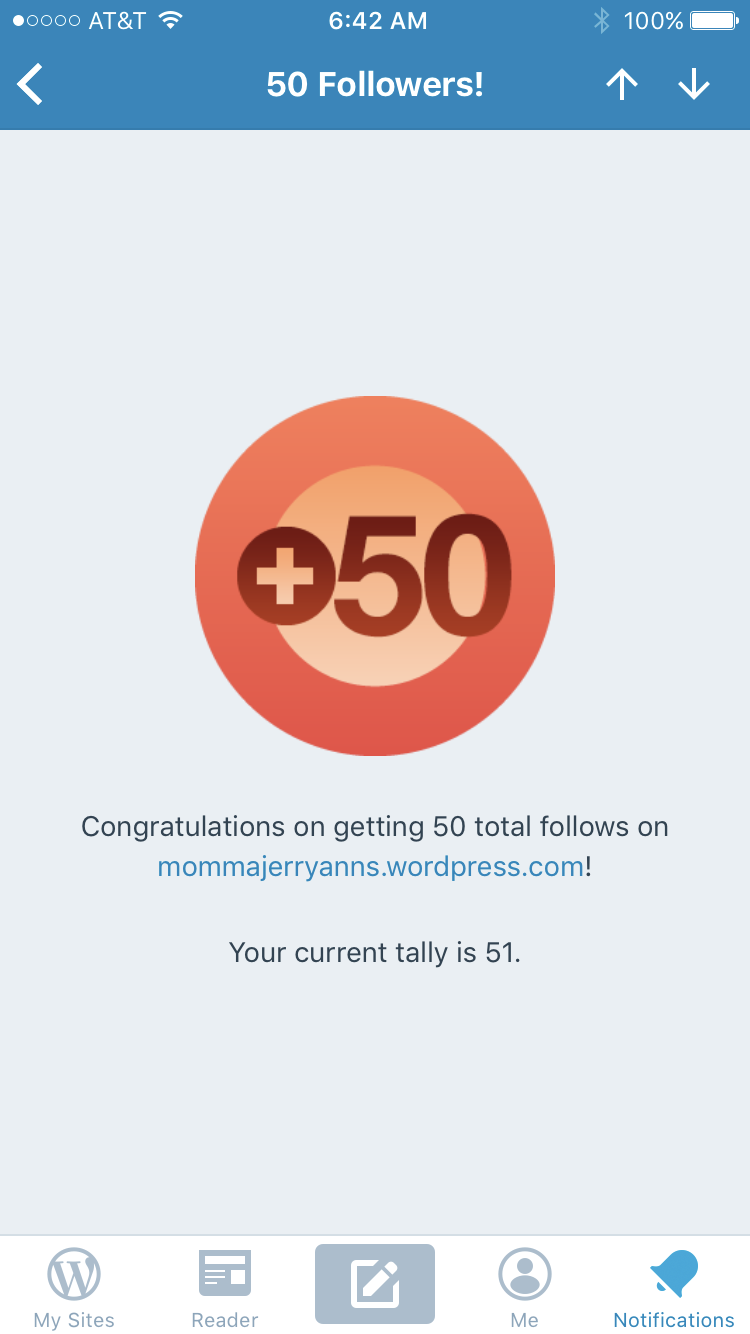 Not sure what I am doing but I so appreciate the follows! Thank you all so very much.  It is hard for me to believe that in December last year I only had 7 official followers.  And, now in five months – 50!