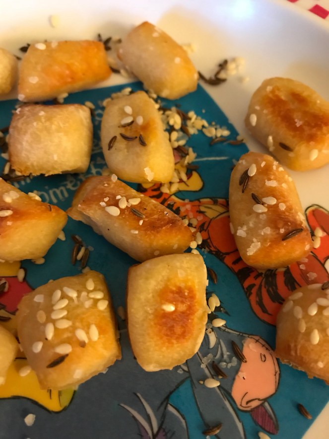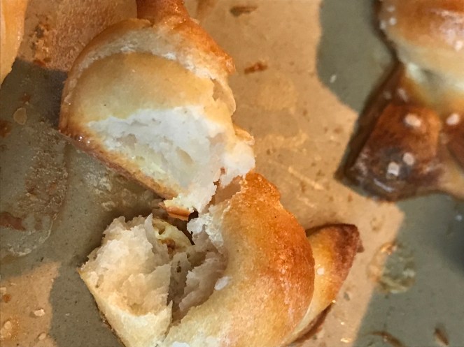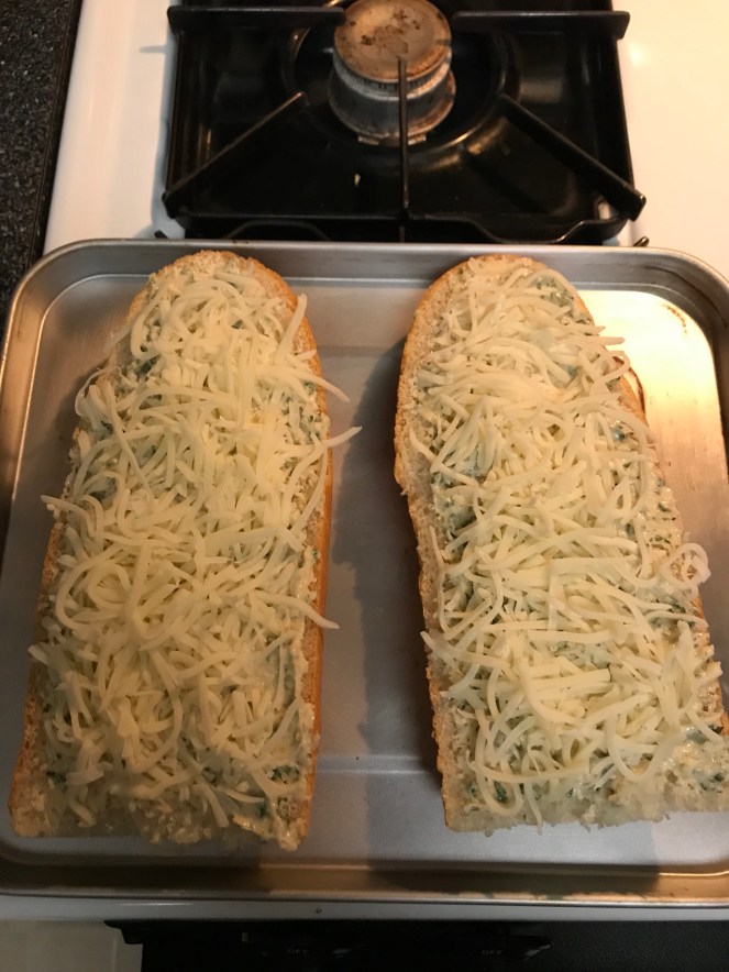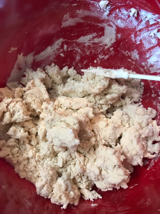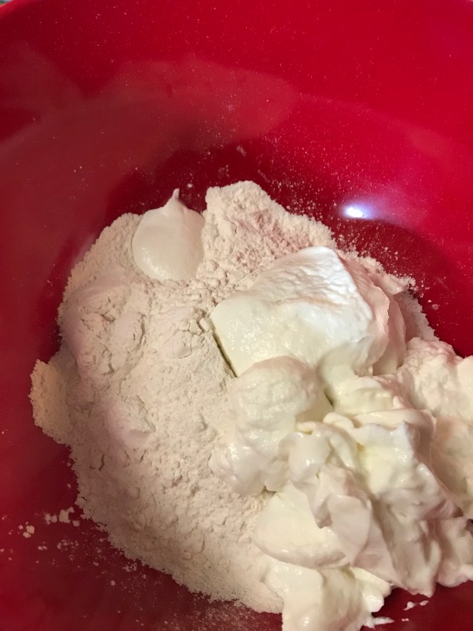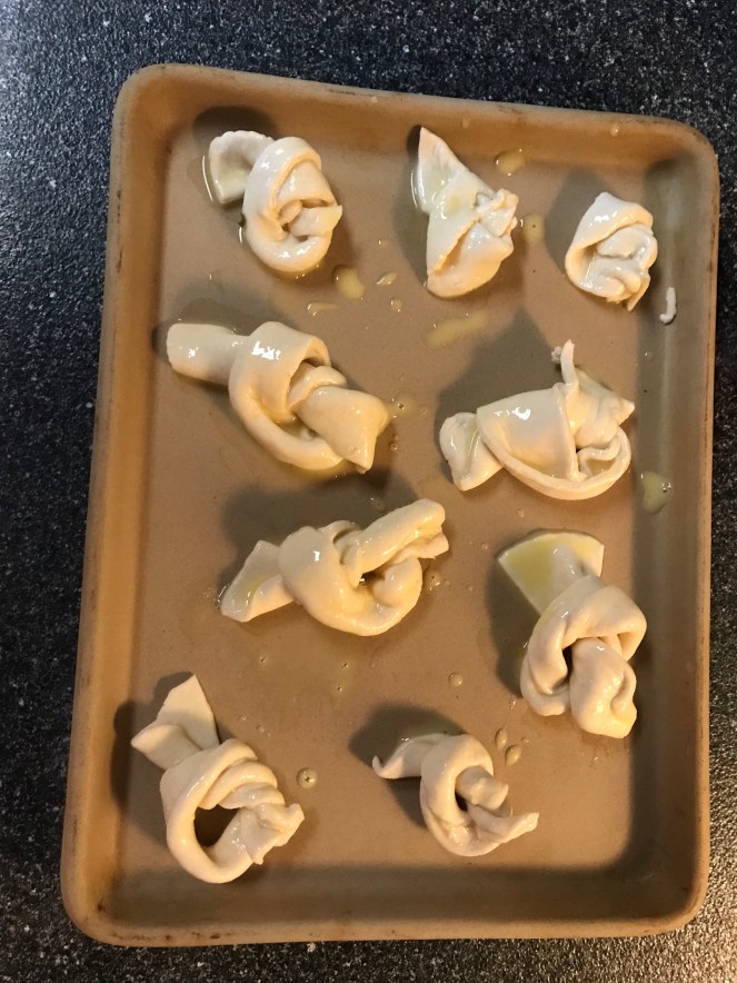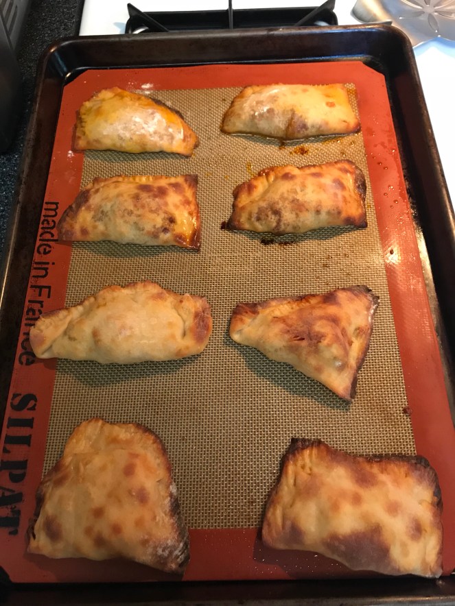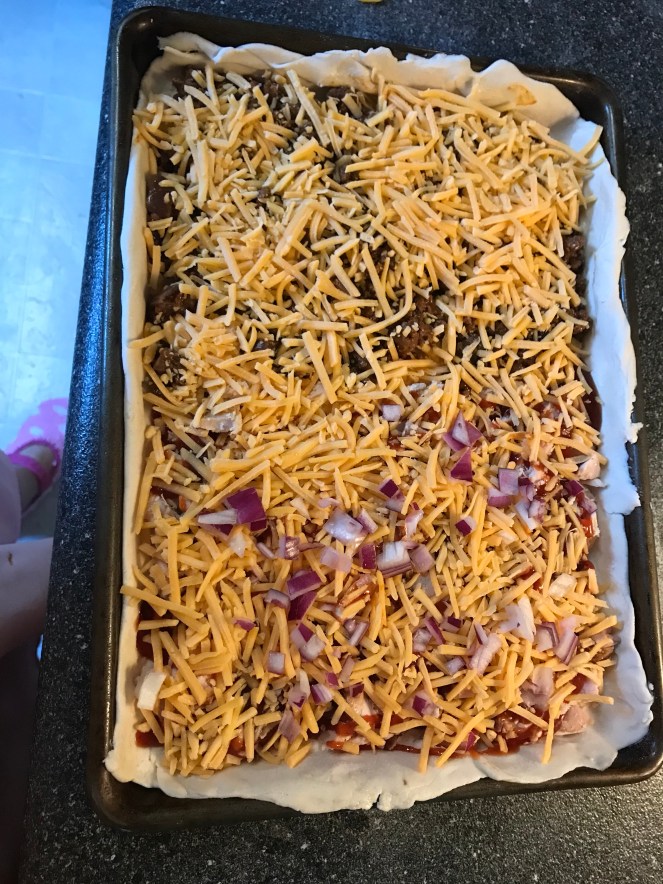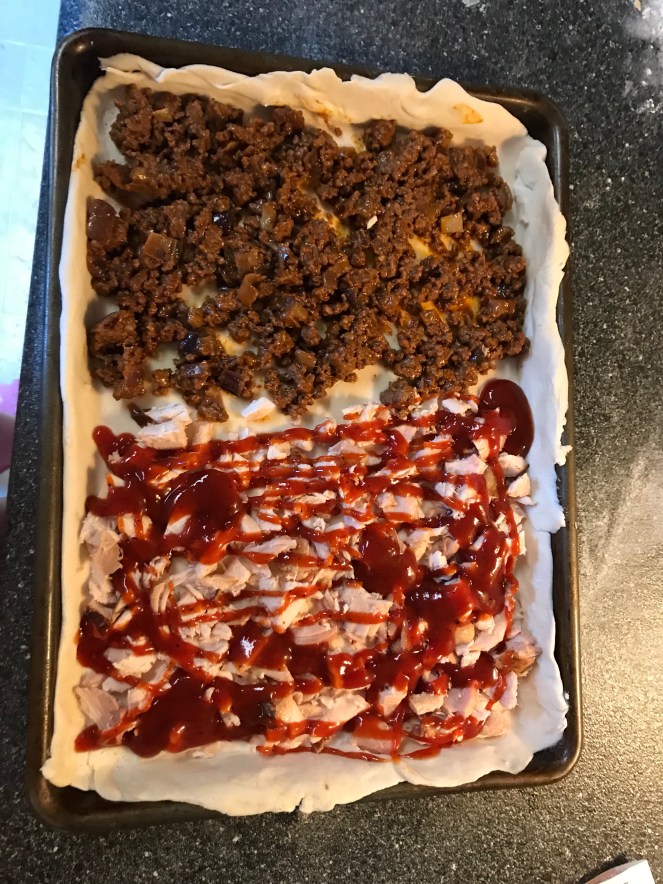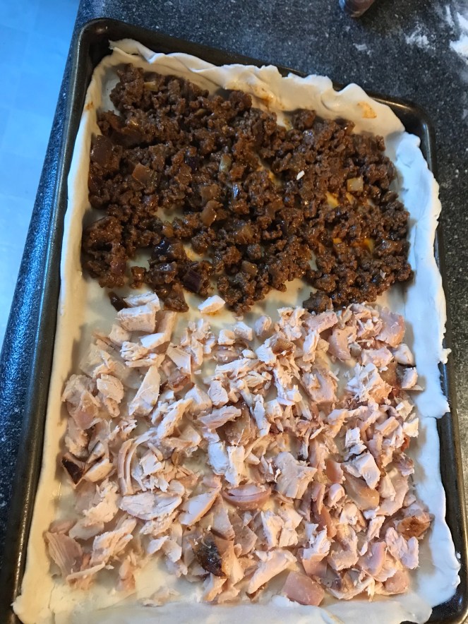 I added some shredded cheddar cheese to both meats, and yes, I cheated and used packaged shredded cheddar cheese. For the remaining dough, I rolled it thin, and placed it in a baking sheet that I sprayed with baking spray.