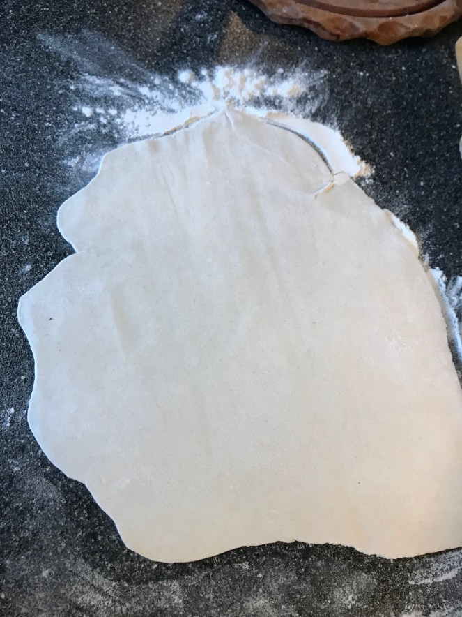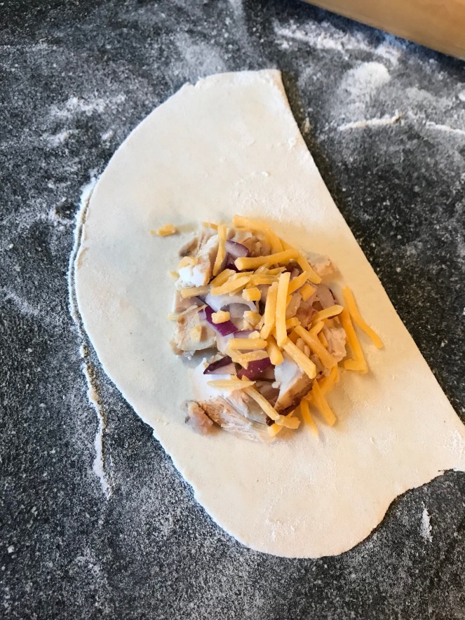 I let the taco meat cool a bit, and chopped up the chicken. I had used a half of a purple onion in the taco meat mixture, and reserved the other half for the chicken portion. Rolled out the chilled dough mixture with some flour on the counter.
