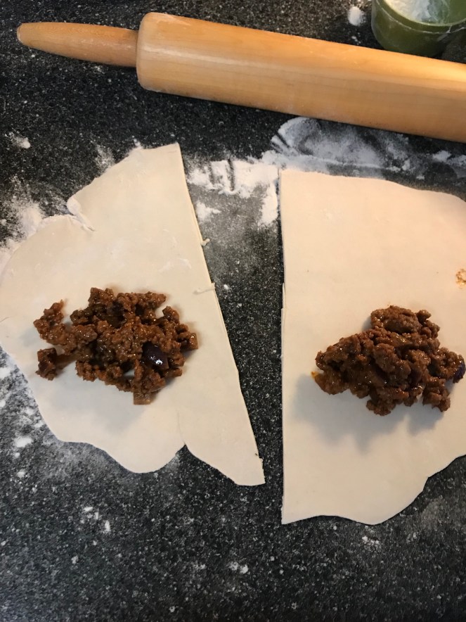 Somewhat sectioned out the portions. Scooped the meat in each, and folded the dough over.