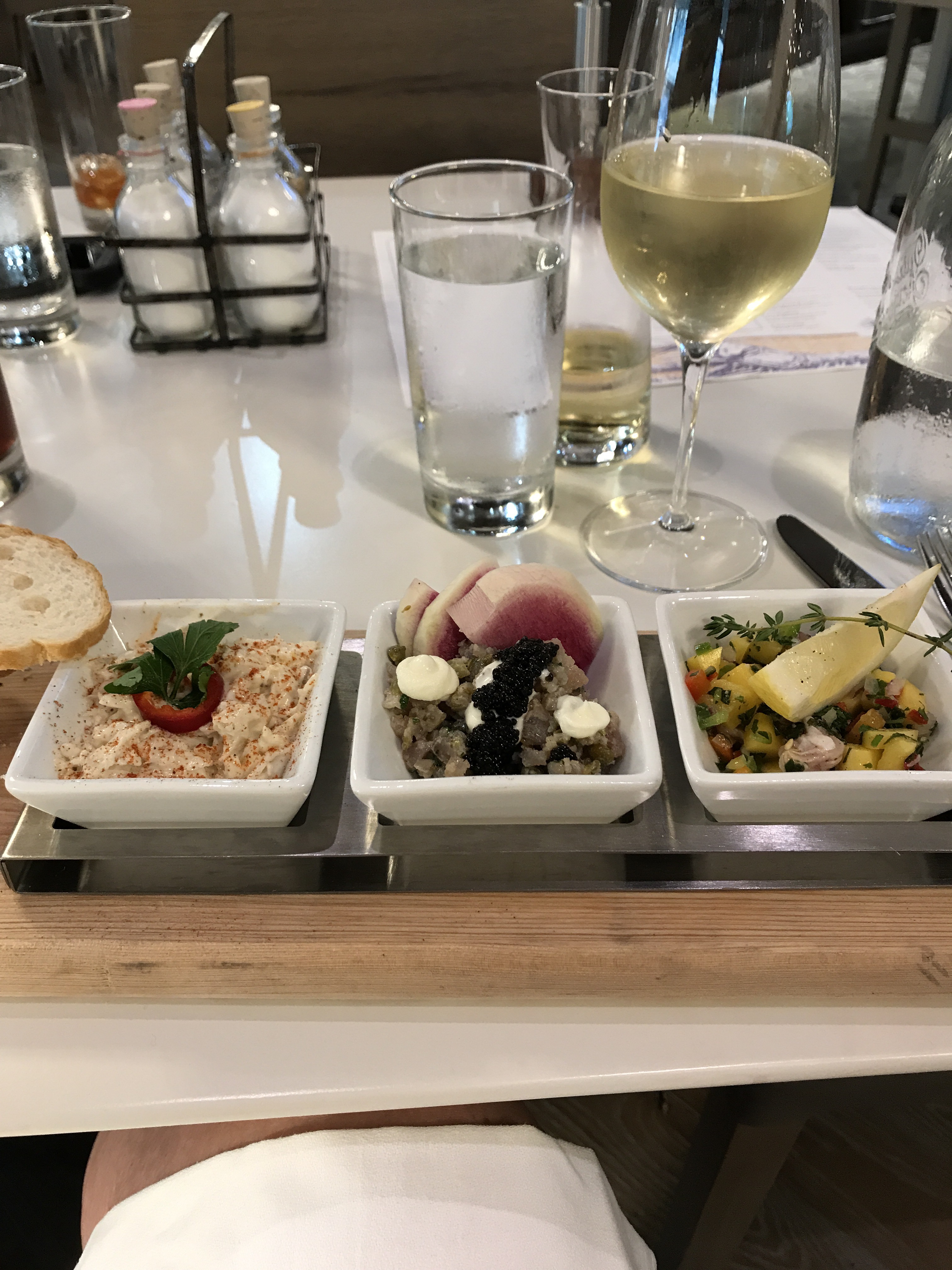 We had a wonderful time. Robin and Lindsey were our servers, and they were helpful, and attentive. David had the smoked fish dip and flatbread meatball pizza, and I had the coastal board with Bluefin Tuna Tartare, Jumbo lump crab salad, and Grouper cerviche. I also had Emeril’s Chardonnay.