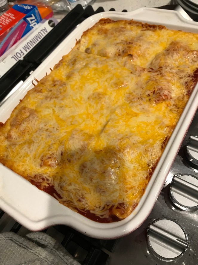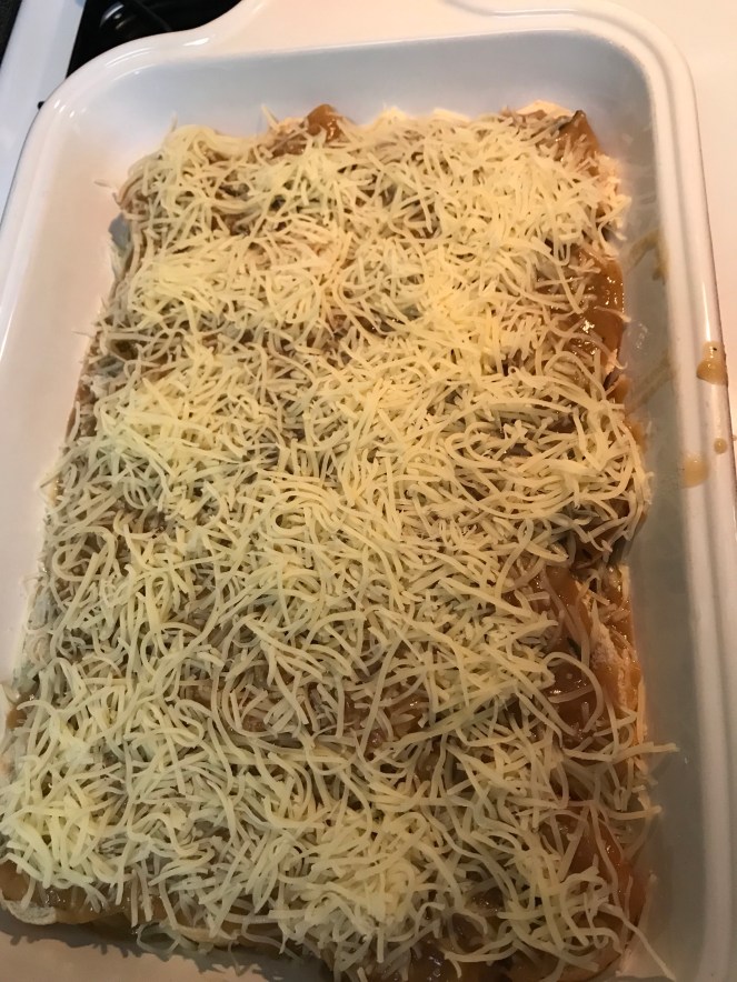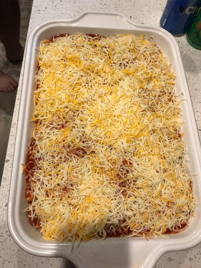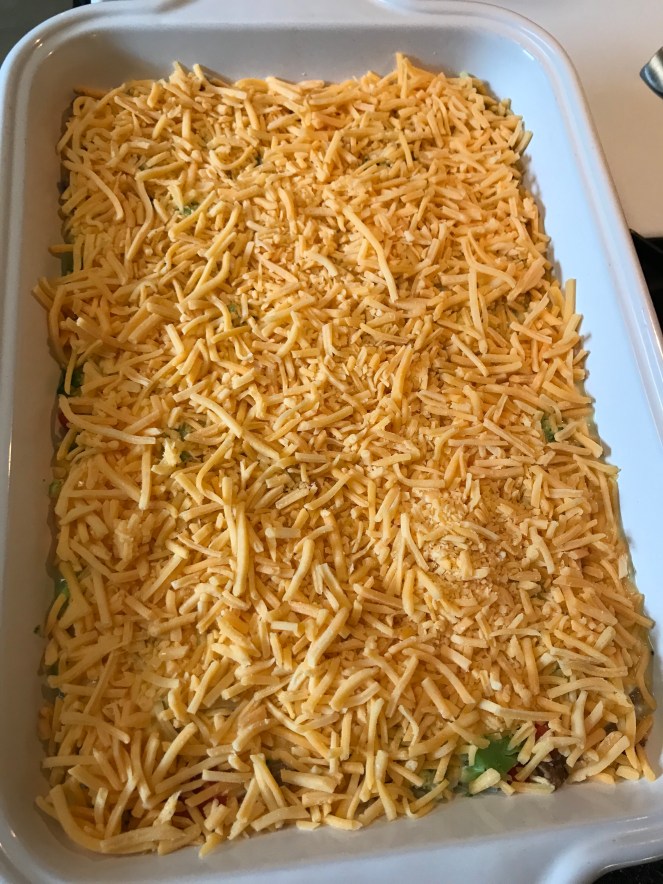 Top everything with shredded cheddar cheese (again, what I had in the freezer).