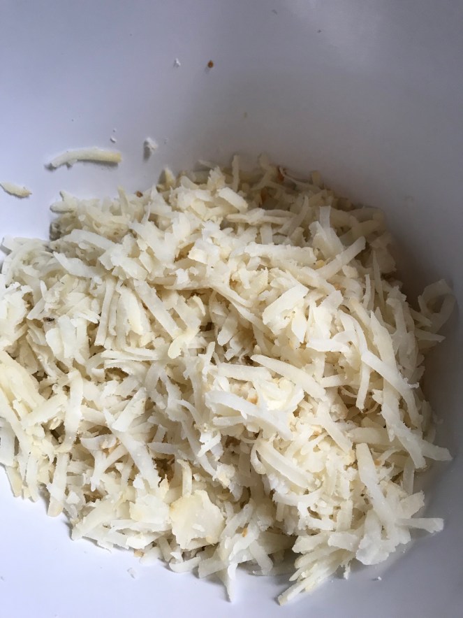 I have made a Breakfast Casserole with a hash-brown crust before but it was made with those frozen hash-brown patties. I decided to shred the leftover baked potatoes, and make a breakfast casserole. Simple – right? It was!