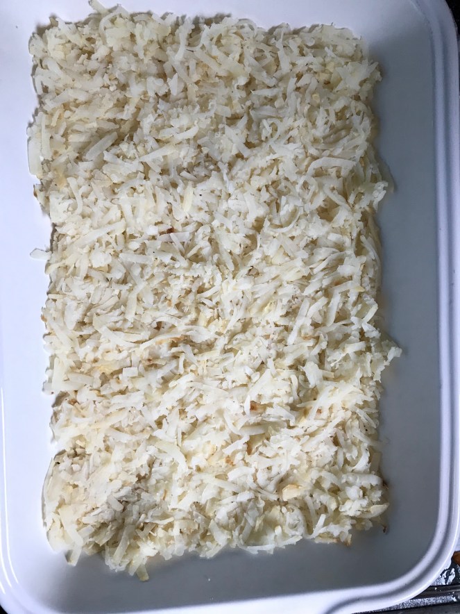 Spray the bottom of a casserole dish (9×13) with non-stick cooking spray, and then layered the potatoes on top.