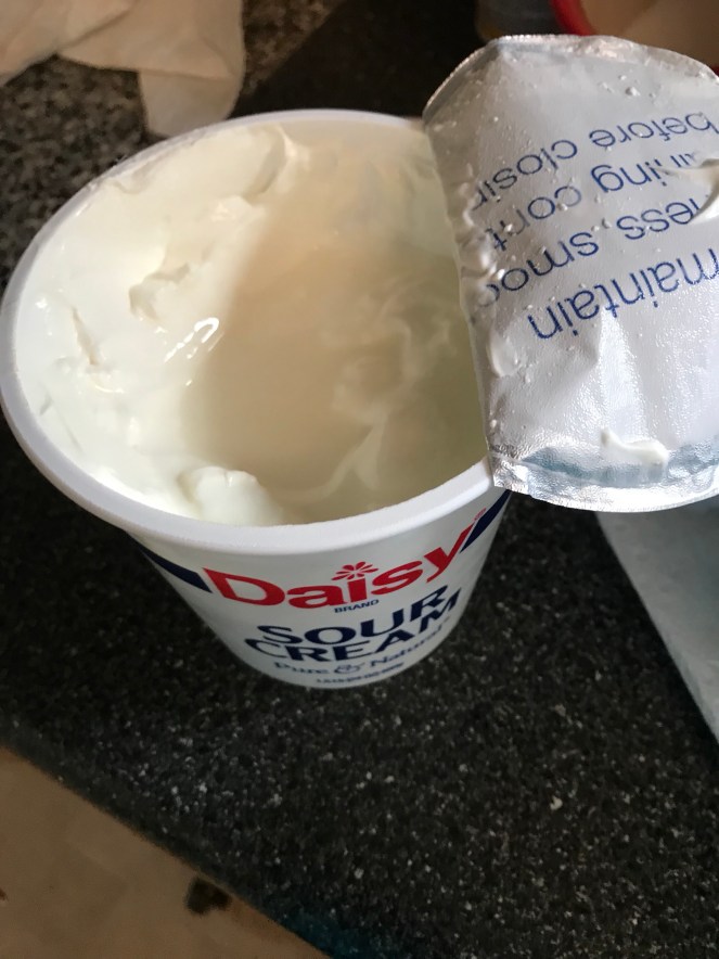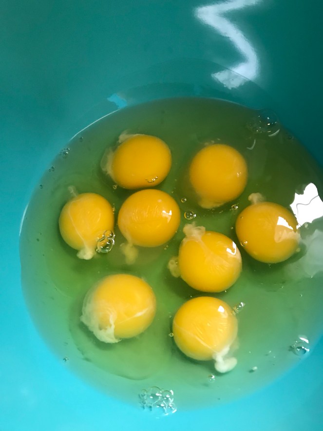(8) Eight eggs, beaten with a cup of sour cream (no milk- do what you can with what you have – right?).