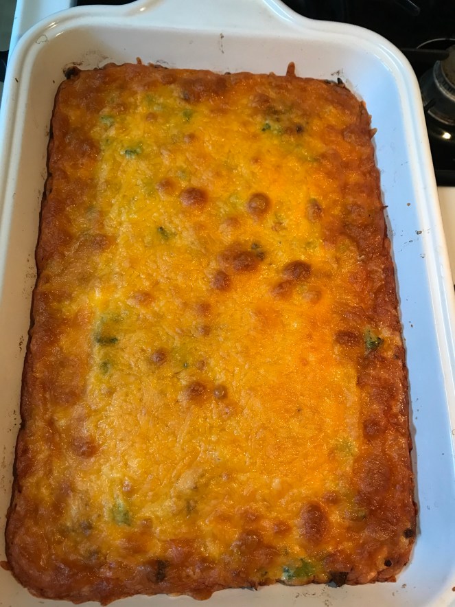 Oven at 350 degrees, and bake for 30 minutes or until golden brown and cooked through. Since everything was already cooked but the eggs, it really is a simple bake.