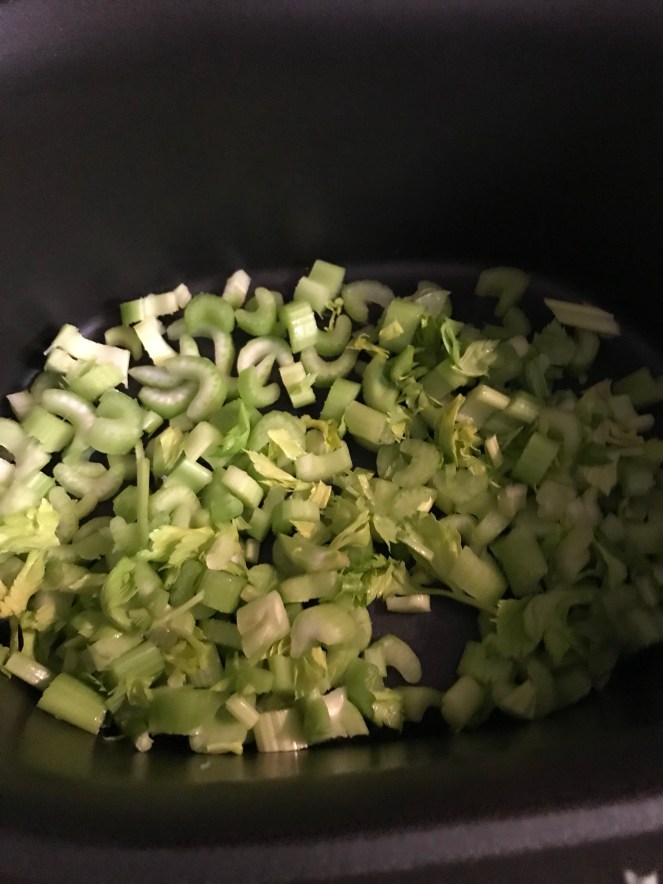 Place chopped celery (4 stalks), and then chopped onion (2) layered in the crock pot.