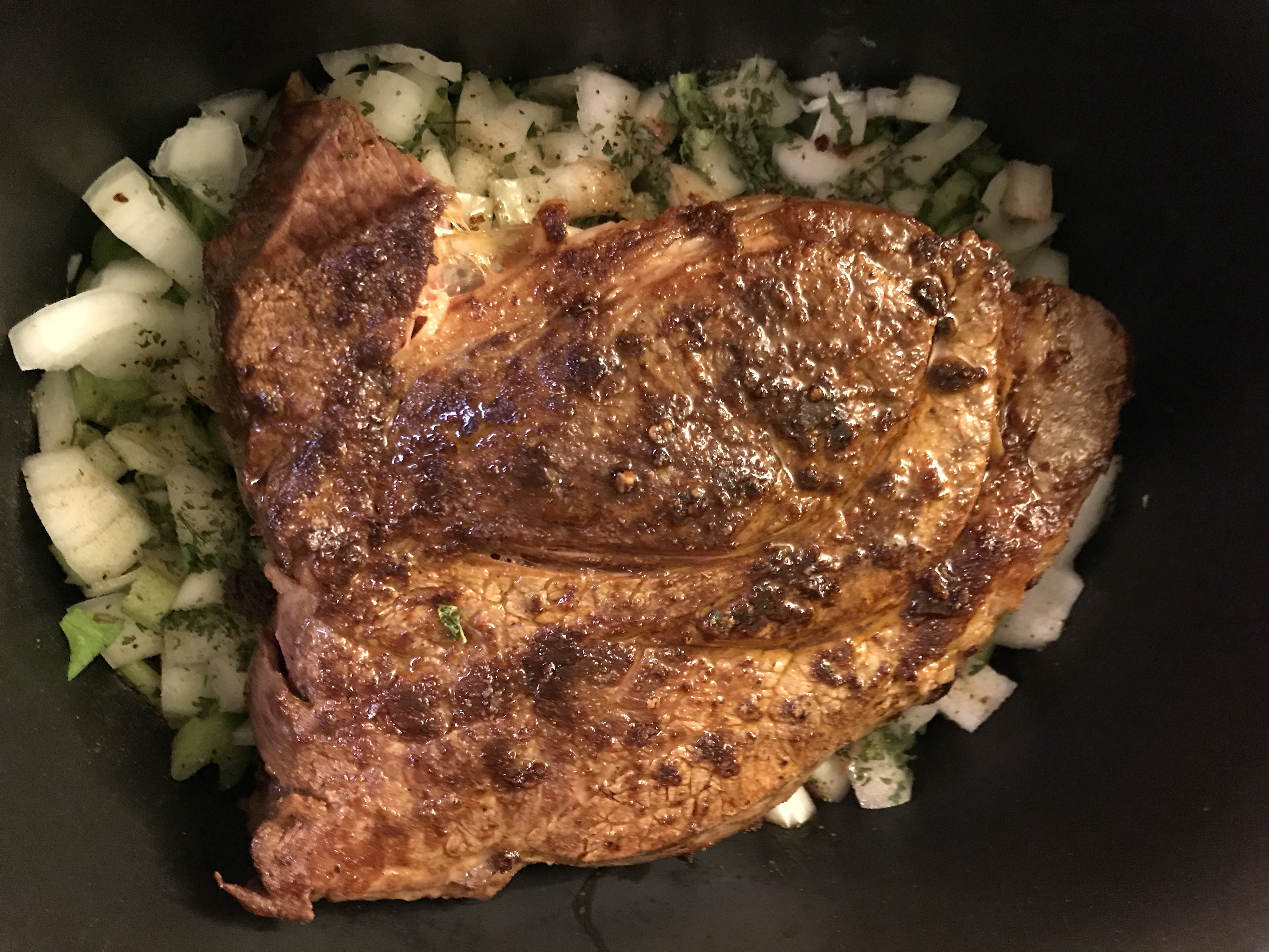 Place on top of the celery and onion layers. I had added some celery seed, pepper and parsley the top of the layer before laying the beef on top.