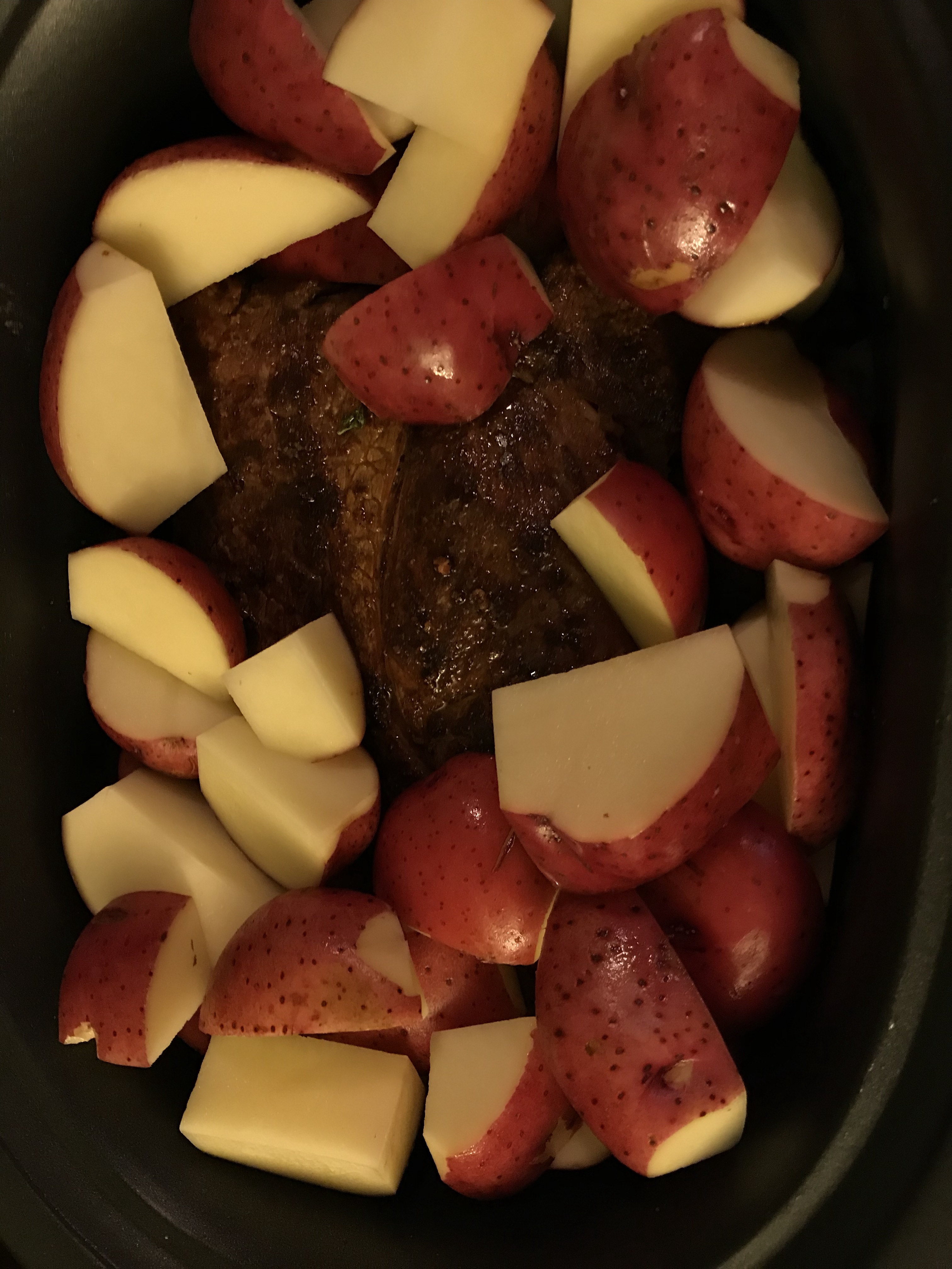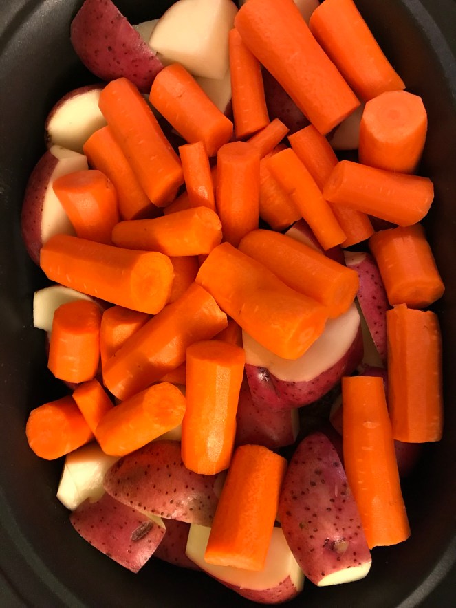 Washed and quartered potatoes, and carrots, and layered those on top of the beef.