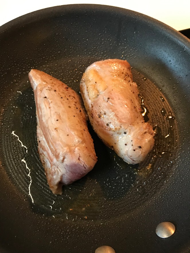 Add in 1/4 cup of balsamic vinegar, and 1/4-1/3 of a cup fig jam or preserves. Stir until blended, and simmer.