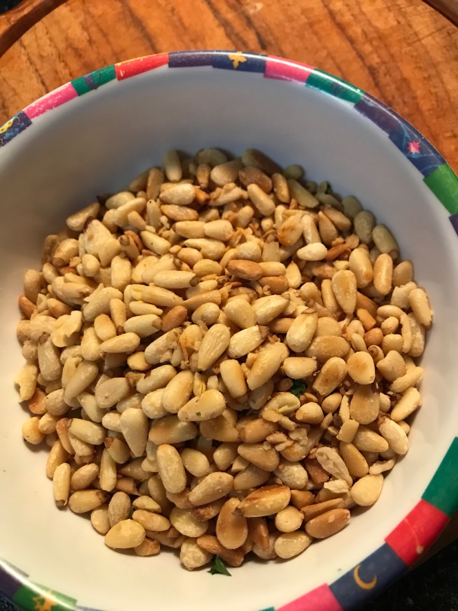 The use a rolling pin or chop as you like to crumble the pine nuts.