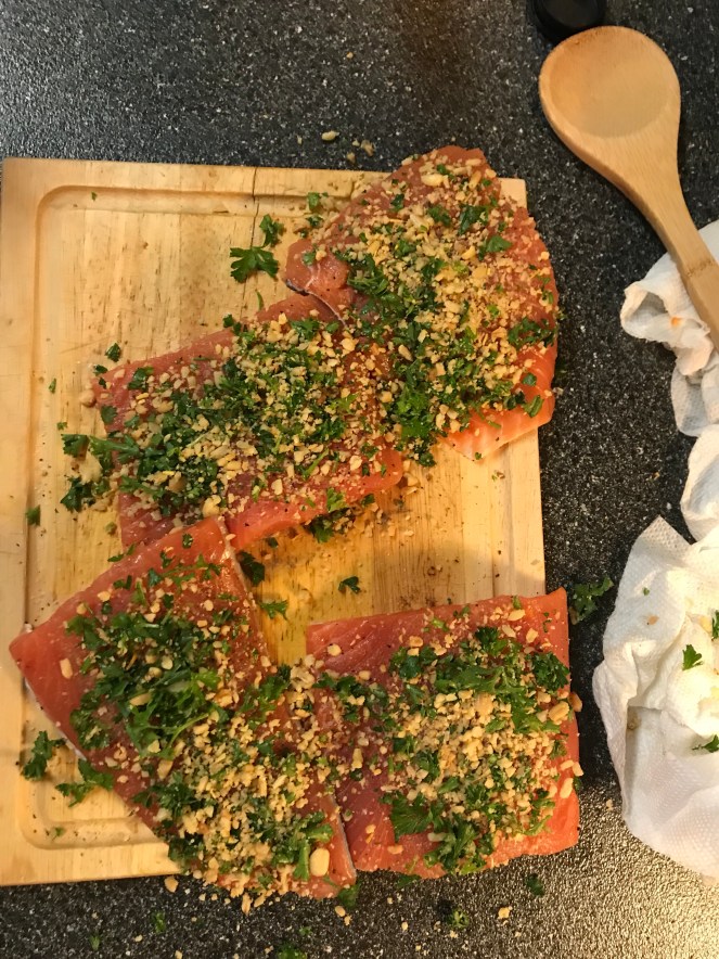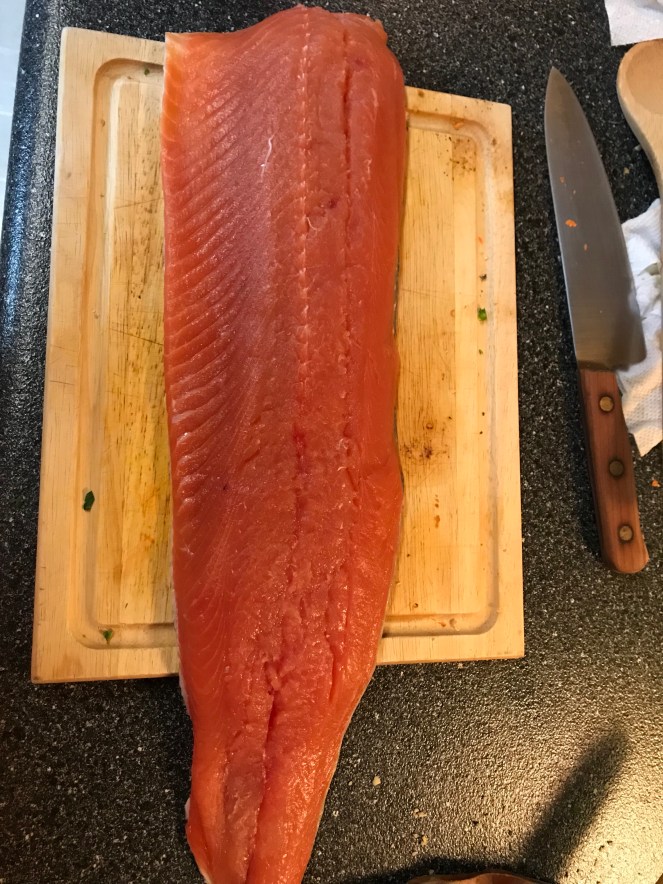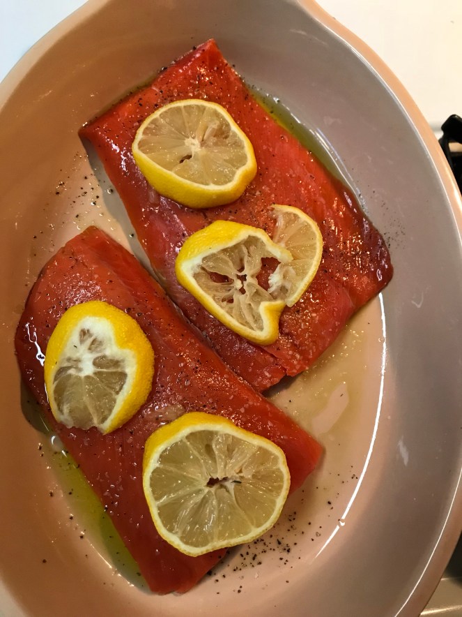 I had purchased this beautiful salmon filet. I cut it into 4 equal pieces for cooking (and I left the skin on—love the skin especially when crispy).