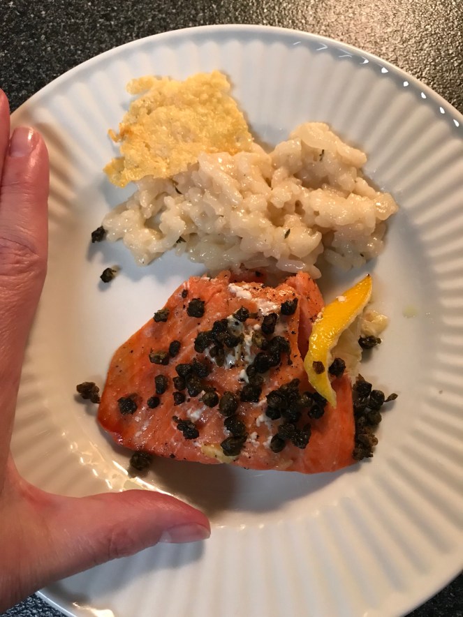 My portion with a spoonful of parmesan risotto, and the salmon with the fried capers. I am seriously in love with this dish.