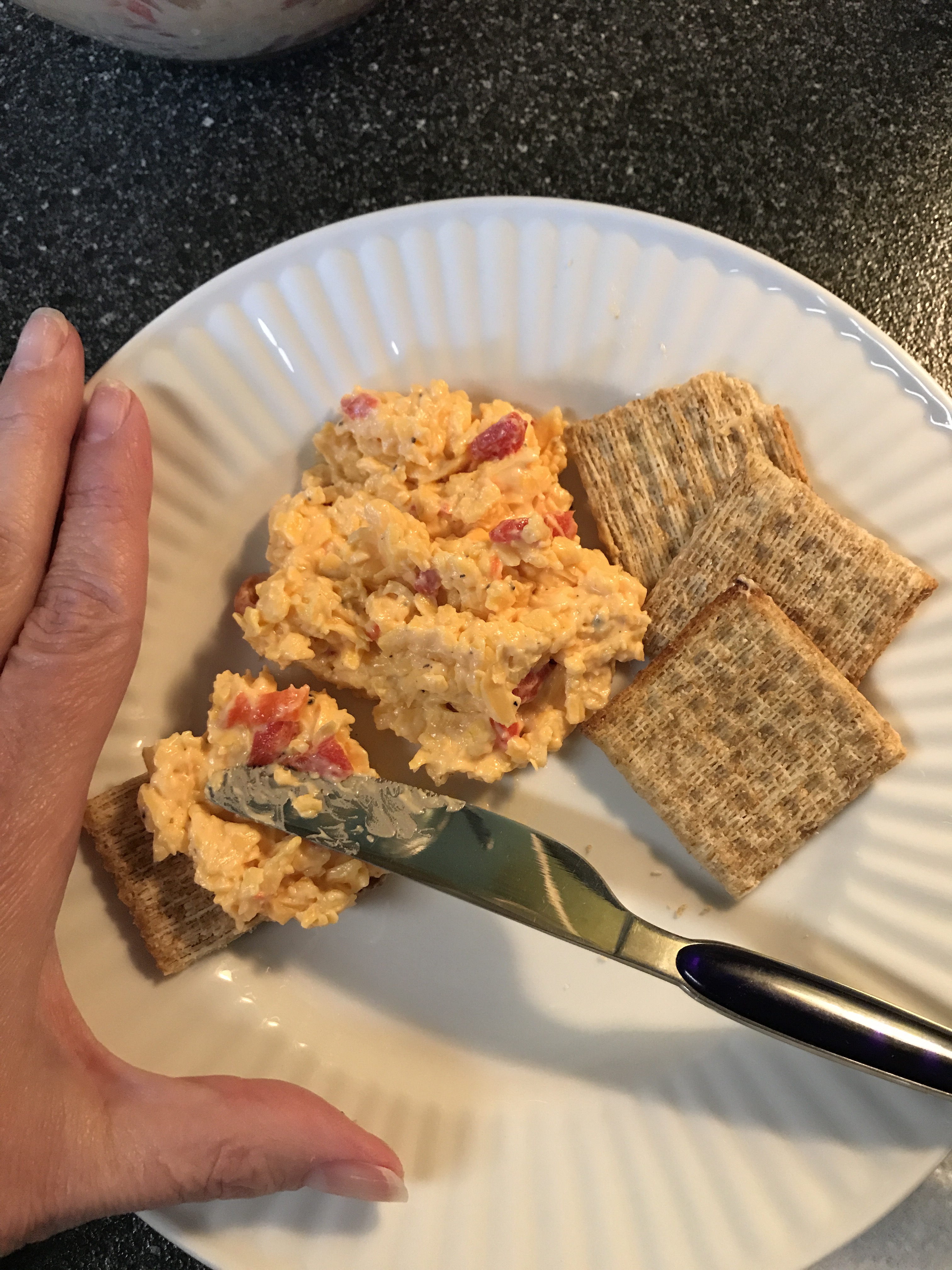 The middle dip is pimento cheese with 2 cups of shredded cheddar, 1 small jar of chopped pimentos with juice, a pinch of crushed red pepper, 1 teaspoon of ground mustard, and about a cup of mayo. I do the mayo last as the juice and cheese dictate how moist it will be.