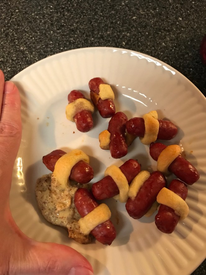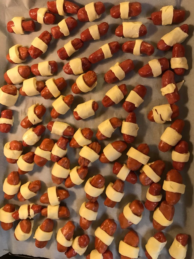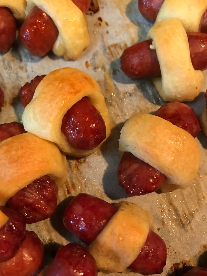 Saturdays are football days, and even with my weight loss surgery I still like to have not so great for me food. Pigs in a Blanket are yummy, little snack bites that are really easy to make. One container of crescent rolls, and a package of lil’ smokies. Roll out the dough, and press the seams together, then cut into smaller strips. Place the sausage in the middle and roll. Bake at 400 degrees for about 20-25 minutes or until done.