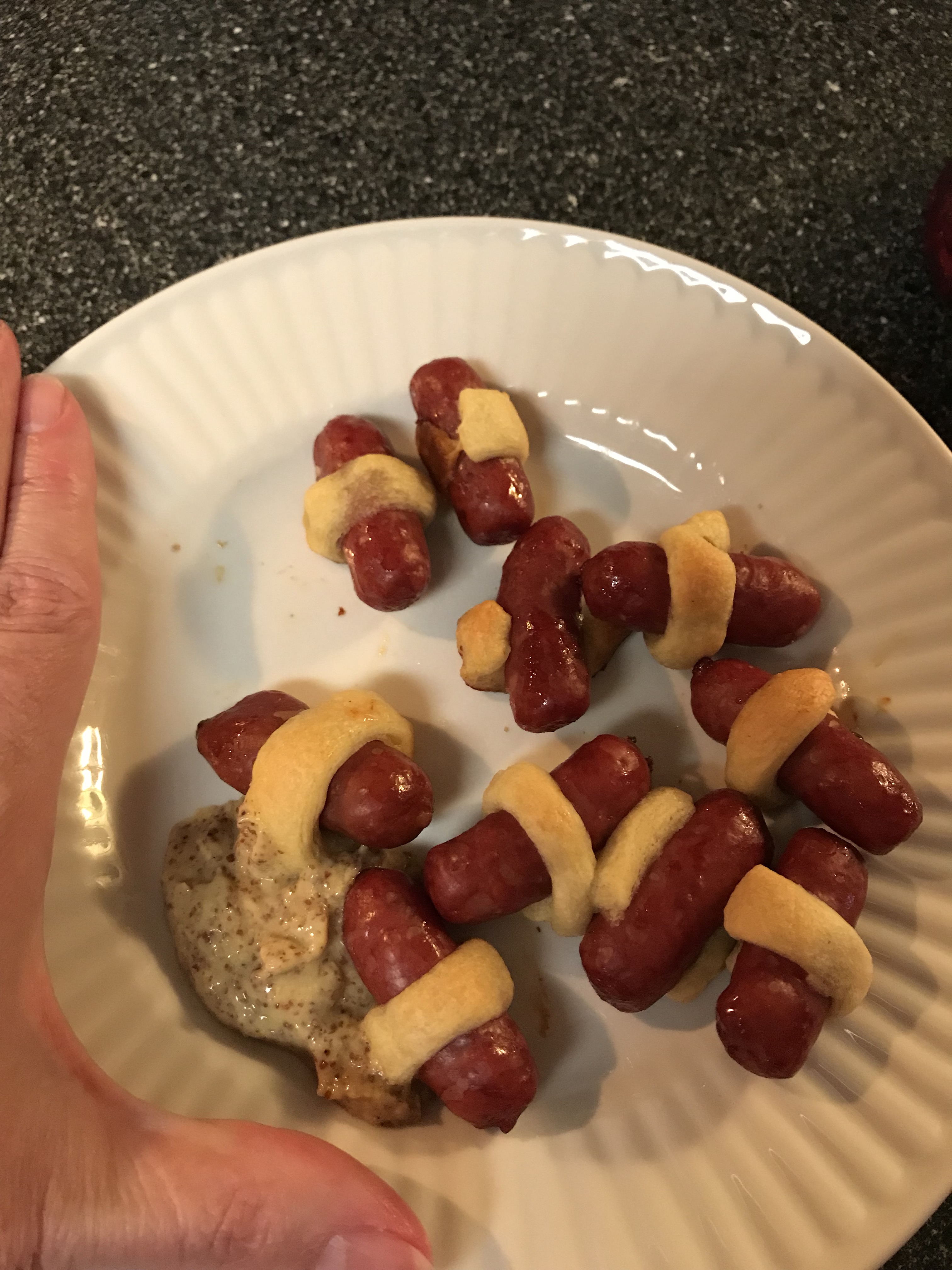 My plate with some of the ones with not a lot of bread on them. Had to have them with Dijon mustard. David loves his with Ketchup. Satisfied my craving, and on the cool day, something warm.
