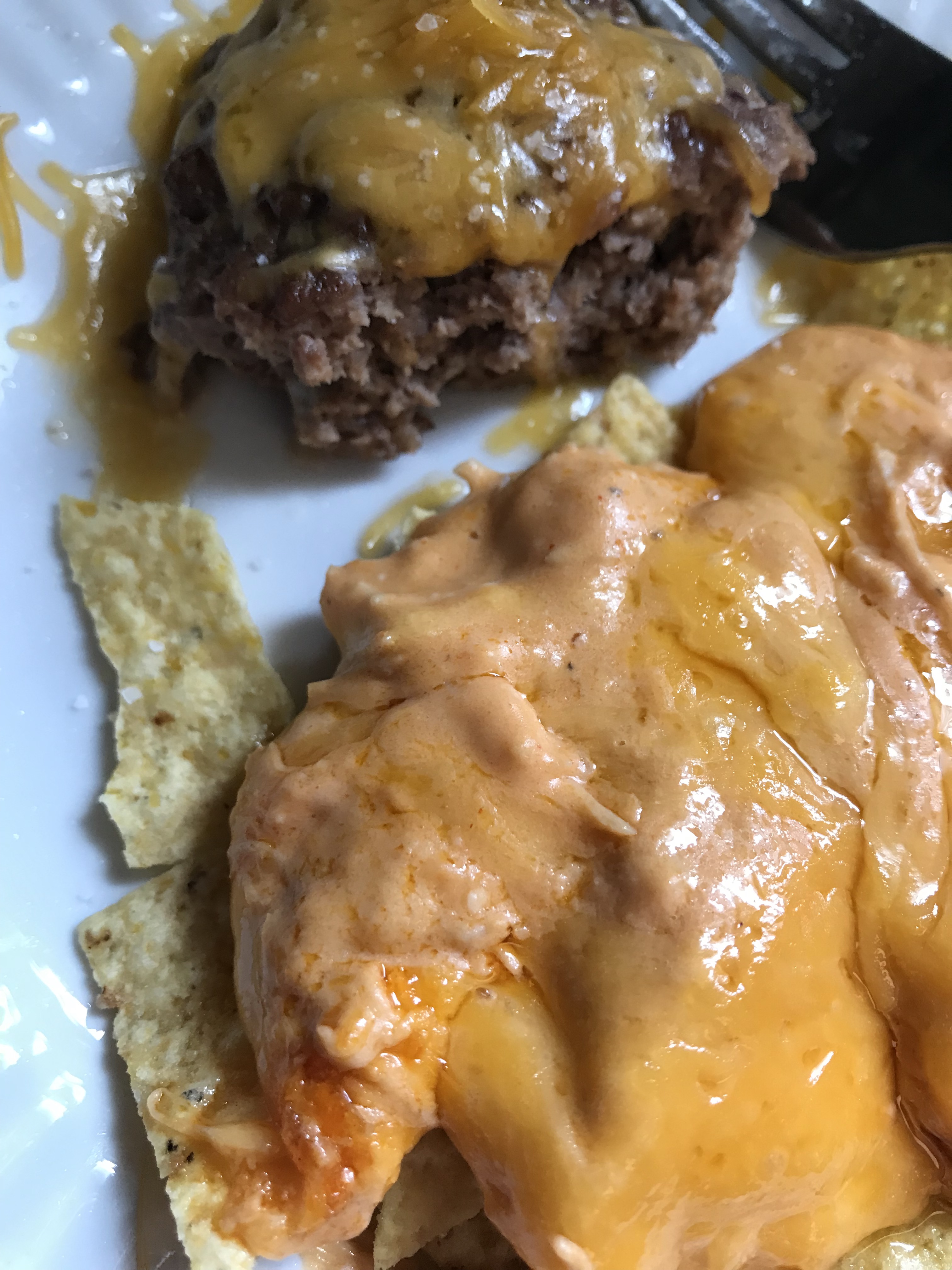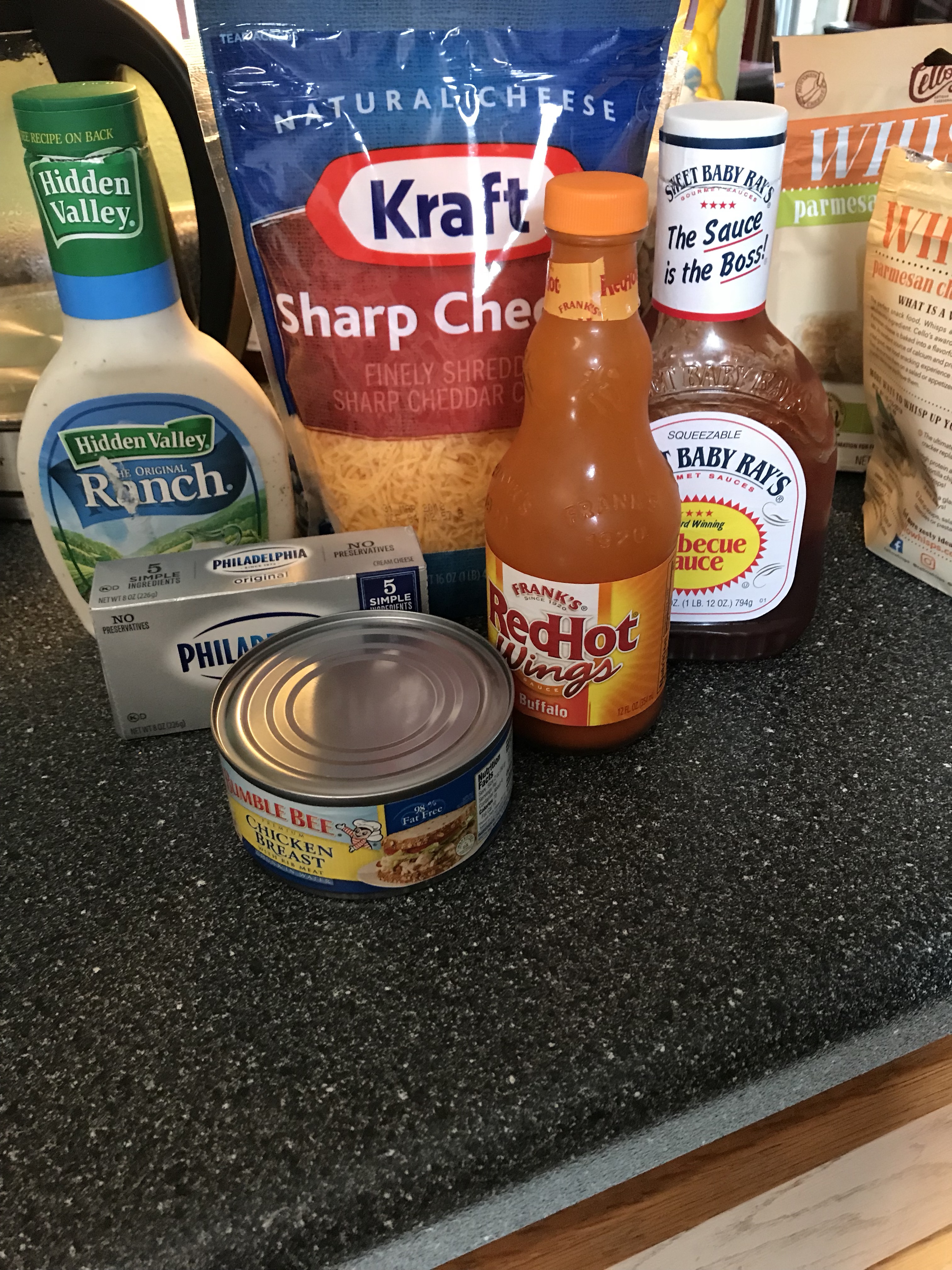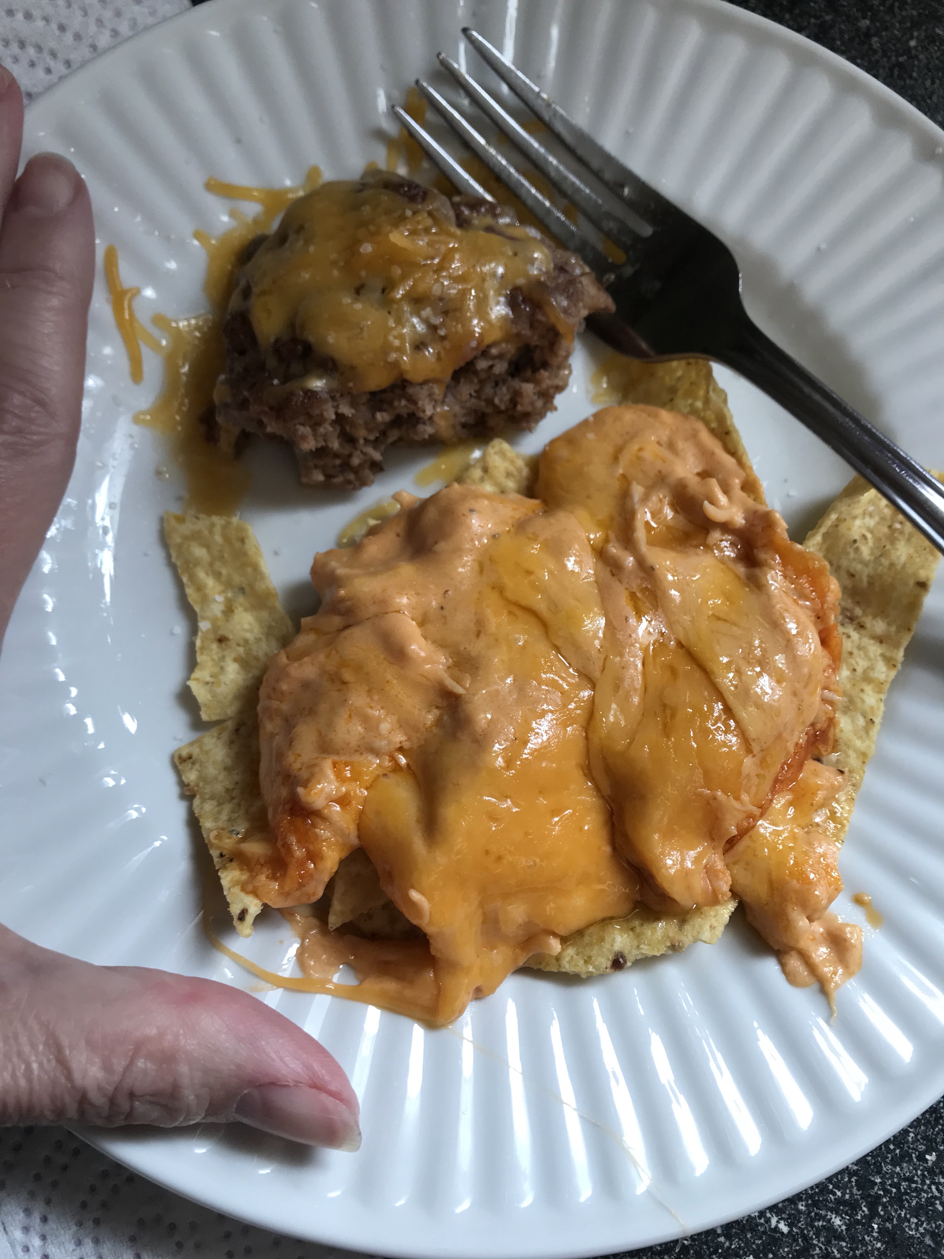 My plate with a 1/4 of a hamburger as well, because I can’t just have buffalo dip. This mixes up effortlessly, and everyone loves it.